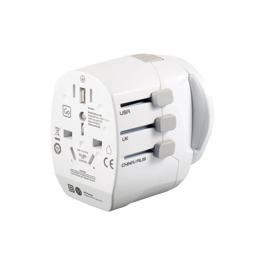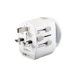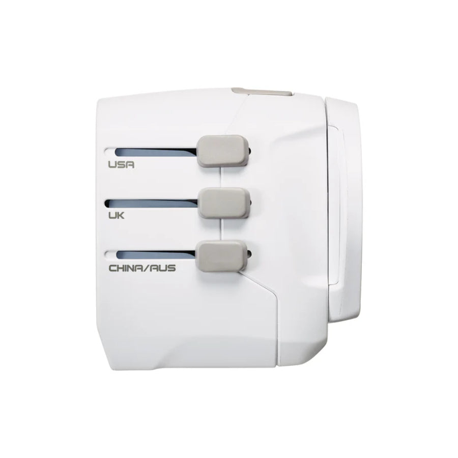 Adecuado para su uso con enchufes con toma de tierra de 3 polos, este adaptador universal + cargador USB doble conecta a viajeros en más de 190 países en todo el mundo. Cuenta con 3 caras de enchufe deslizantes que se alternan entre las configuraciones estadounidense, británica y australiana / china. Simplemente presiona el botón en la parte superior del adaptador de viaje, desliza los pines correspondientes y listo. Además, un adaptador Euro desmontable convierte los enchufes con conexión a tierra de 3 polos para adaptarse a la mayoría de los enchufes europeos. Ideal para alimentar dispositivos importantes, los 2 puertos USB tienen una salida de potencia de regulación automática de 2.4 A cuando se realiza la carga dual.