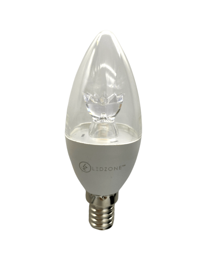 Ampolleta E14 tipo vela de 4 watts de potencia y luz cálida 2700k transparente. Diseño único que renovará el look de tu hogar. Lúcela en interiores en lámparas de mesa o colgantes.