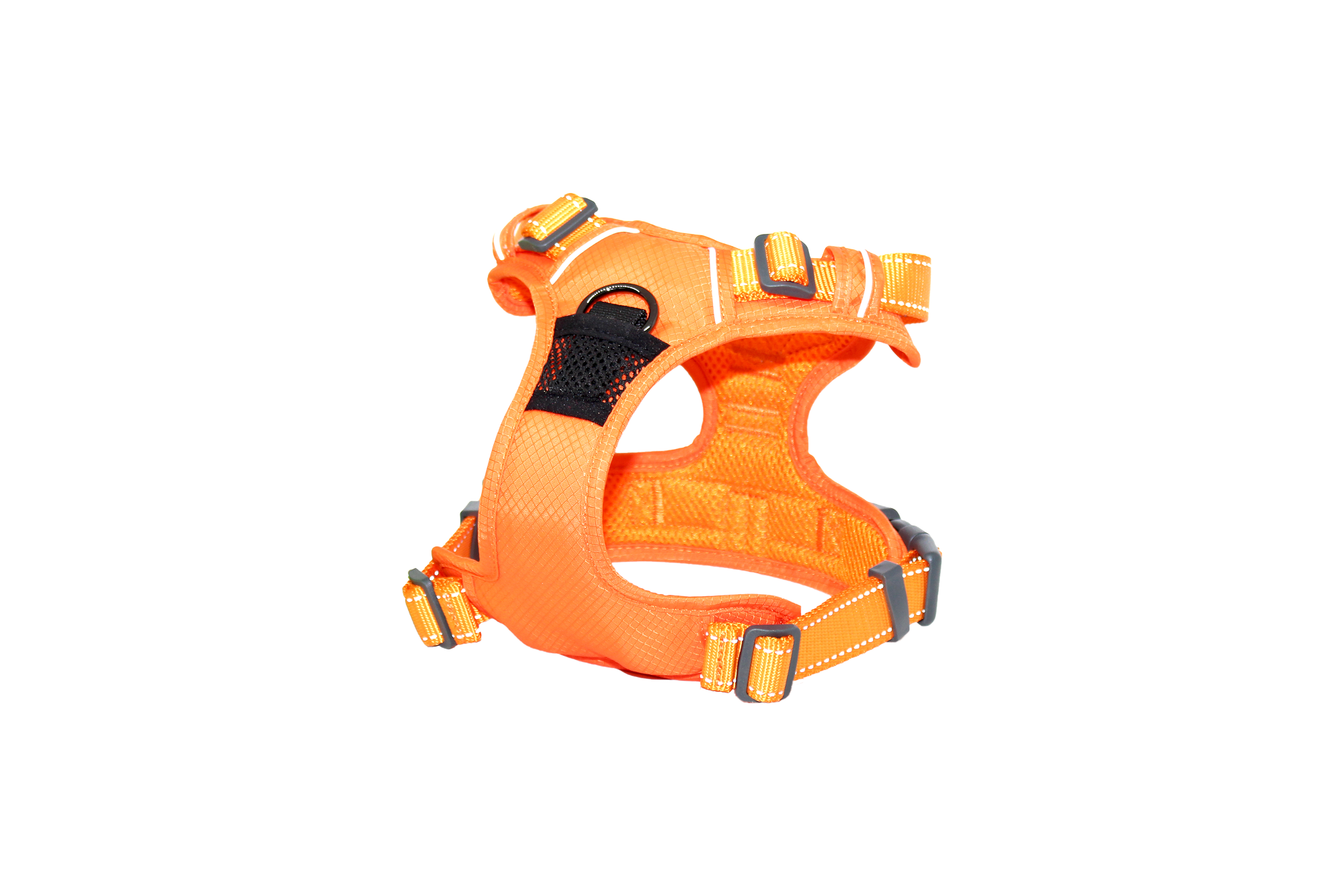 Arnés con diseño deportivo, cómodo y original. Fabricado en nylon transpirable y en divertidos colores. Disponible en varios colores y tallas. Con argolla metálica en la espalda para enganchar la correa