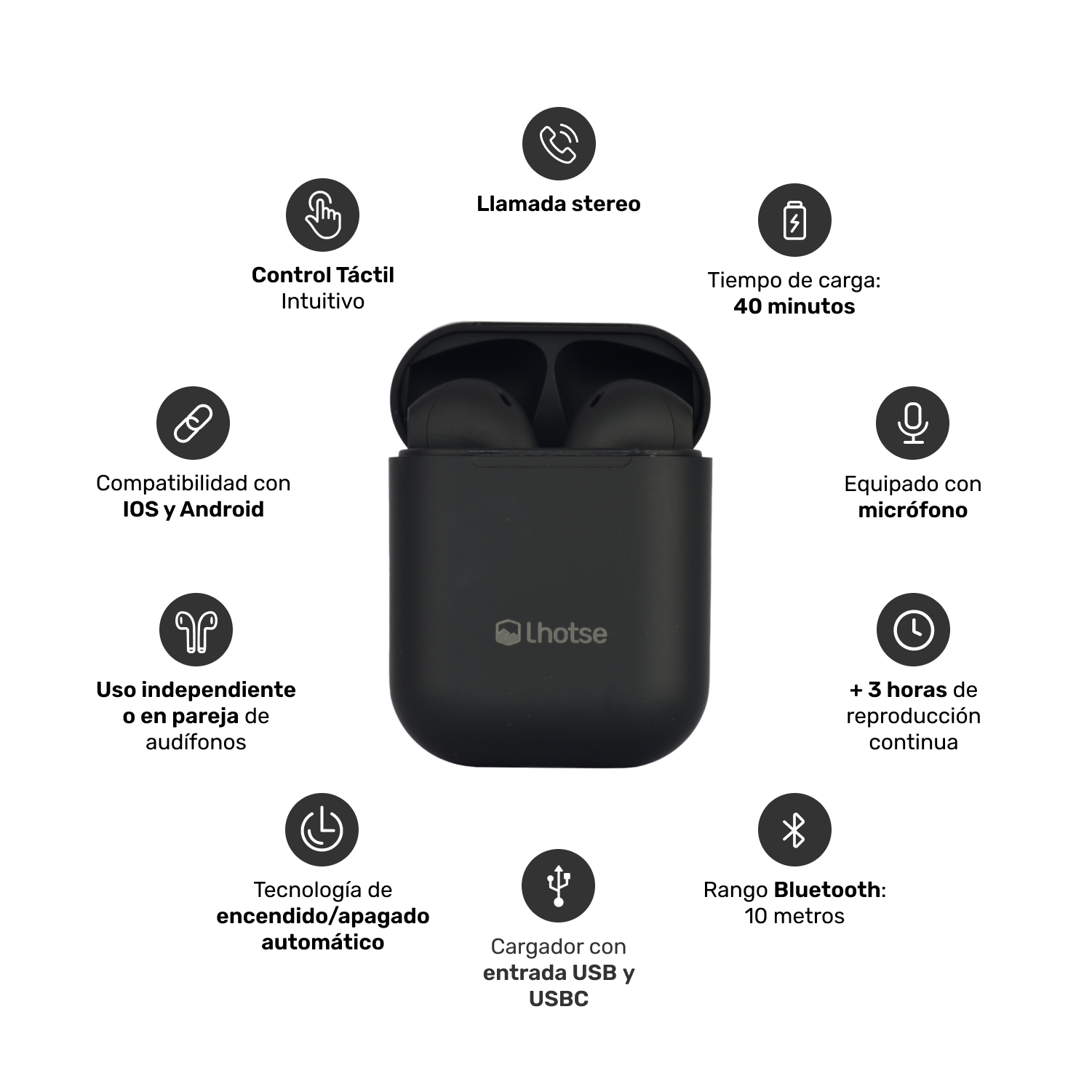 • Control táctil: reproduce música, contesta y termina tus llamadas.