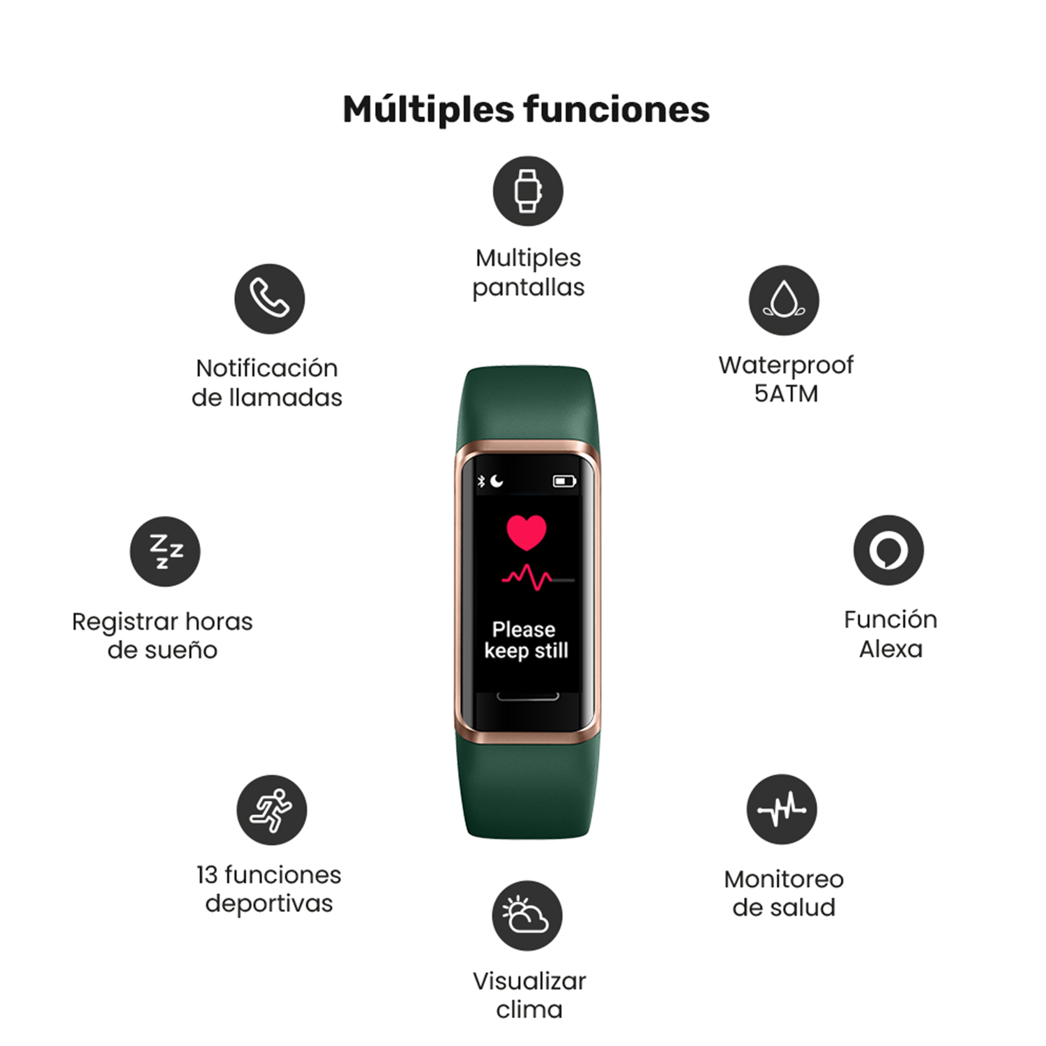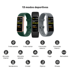 • 13 modos deportivos: trote interior y exterior, caminata interior y exterior, bicicleta interior y exterior, cricket, senderismo, natación, yoga, remadora, elíptica, fitness.