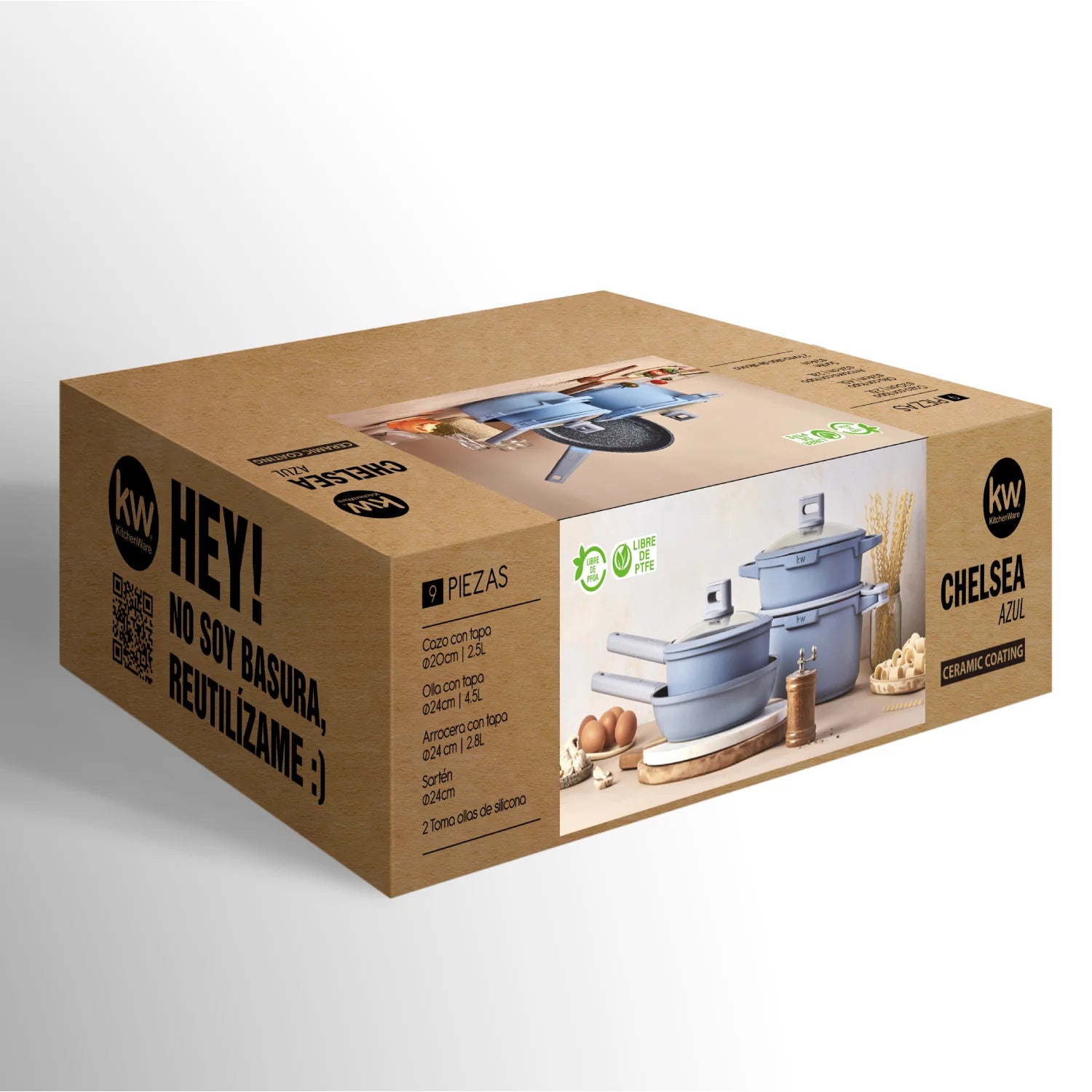 Prepara tus comidas favoritas con la Batería de Cocina Chelsea de 9 piezas. Fabricada en aluminio fundido en un hermoso color azul, es apta para todo tipo de cocinas. ¡Cocina con estilo y facilidad gracias a sus 9 piezas!