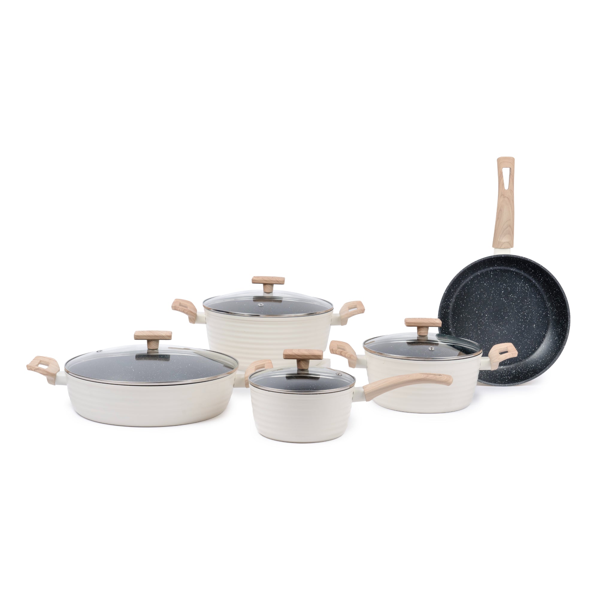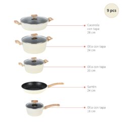 Descubre la elegancia y funcionalidad con la Batería de Cocina Antiadherente Savannah de 9 Piezas. Fabricada en aluminio forjado de alta calidad, con un revestimiento antiadherente de mármol que asegura una cocción sin esfuerzo. Compatible con todas las cocinas, incluso inducción, y con mangos de baquelita resistentes al calor para un agarre seguro. Ideal para quienes buscan un diseño sofisticado y duradero en su cocina. ¡Transforma tu forma de cocinar con Savannah!