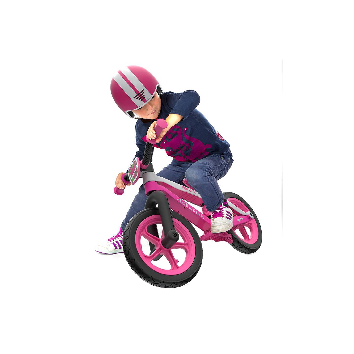 La bicicleta de equilibrio BMXie no para: un cuadro de bicicleta de estilo BMX real, un tubo de gran tamaño, pero extremadamente ligero. Diseño superduper cool, asiento ajustable (y ajuste del asiento mejorado) sin herramientas y con reposapiés y freno de pie integrados para un deslizamiento divertido. ¿Necesitas algo más? ¿Tal vez una matrícula frontal desmontable con varios adhesivos para una personalización increíble? ¡Lo tenemos! ¡Esta es probablemente la bicicleta de equilibrio más genial del mundo! Neumáticos Airless RubberSkin ~ excelente agarre y sin balbulas: eso es lo mejor de ambos mundos. Exactamente lo que cada bicicleta de equilibrio Chillafish necesita.
