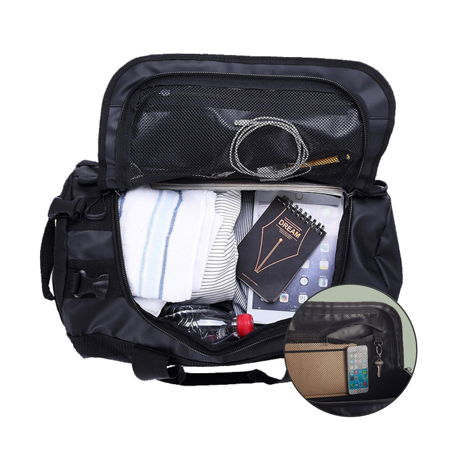 En su interior, encontrarás un práctico compartimento de malla en la parte superior, ideal para organizar tus accesorios y tenerlos siempre a mano. Con tres bolsillos diseñados para maximizar tu organización, el Traveller se posiciona como el bolso impermeable definitivo para quienes buscan combinar funcionalidad, durabilidad y estilo en cada viaje.