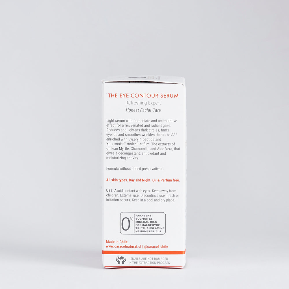 Fina y potente crema que ayuda a reducir ojeras, desinflamar el contorno de los ojos y reafirmar los párpados. El extracto filtrado de baba de caracol junto a los extractos de Murtilla y Manzanilla ayudan a regenerar y mantener la zona desinflamada. Contiene Eyeseryl®, efectivo tetrapéptido que descongestiona y combate los signos del envejecimiento y cansancio en la zona de los ojos. Libre de aceites y fragancia. Uso: Día y noche. Todo tipo de piel. 83,5 % de extracto filtrado de baba de Caracol.