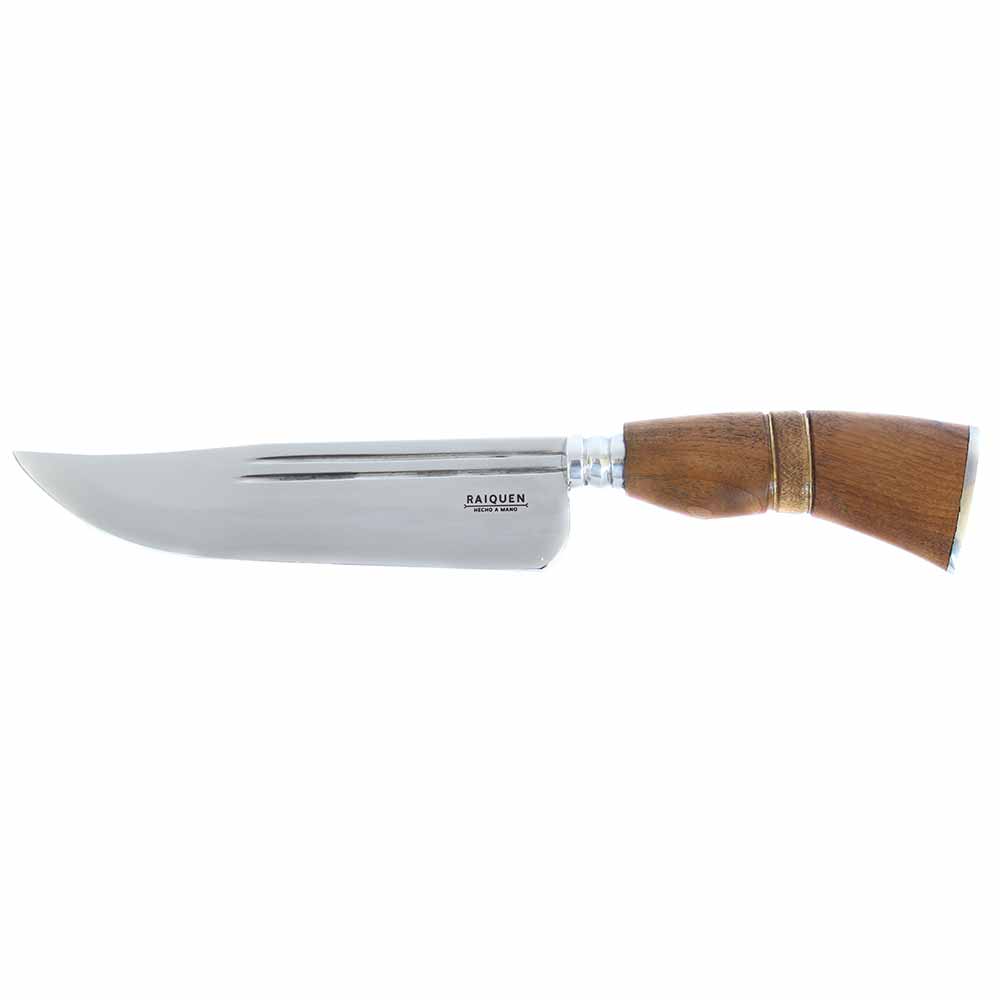 Espectacular cuchillo con mango confeccionado con madera. Hoja de acero inoxidable de 4mm de espesor. Practica funda de cuero, con suplemento para colgar del cinturón.