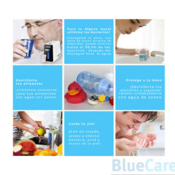 El generador de agua Bluecare® Blue Oxygen produce concentraciones de oxígeno azul que inhiben y matan el 99,9% de las bacterias. El principio de desinfección es que el 03 tiene una fuerte actividad de oxidación y mata al con tacto creando una reacción bioquímica dentro de las bacterias, virus y células.