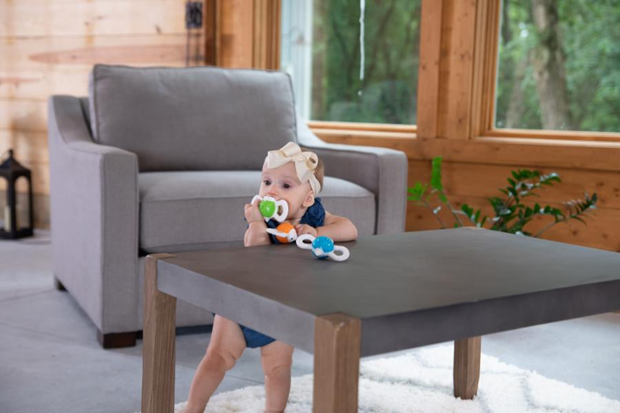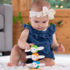 Las tres abejas se conectan magnéticamente para apilarse sobre la base de panal reversible. Gírelos, muévalos y luego sepárelos para explorar cada uno. Las alas de silicona texturizadas fascinan los dedos y alivian las encías doloridas, los colores brillantes y los ojos grandes hacen volar la imaginación. Base hecha en plástico ABS, con imanes en su interior. Alas de silicona suave. Sin BPA. No tóxico. Diseño y materiales de alta calidad – excepcionalmente segura.