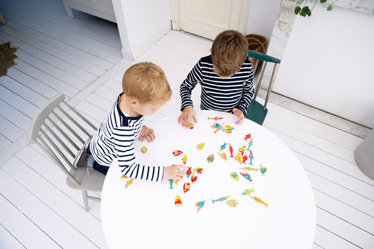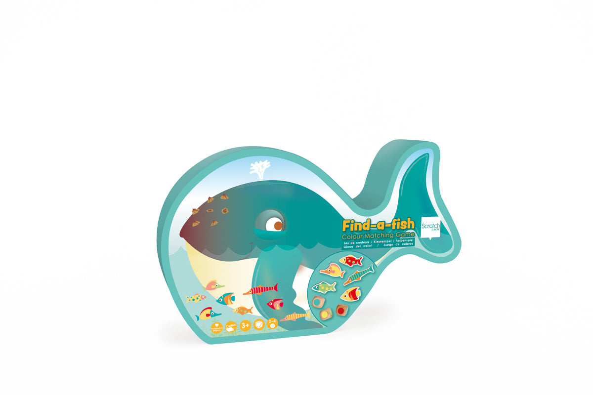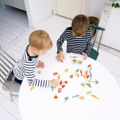 Divertido juego para jugar entre 2 a 4 jugadores. Primero pon todos los peces sobre la mesa, luego tira los dados, y debes intentar encontrar un pez que tenga la misma combinación de colores. El jugador que encuentra más peces gana.