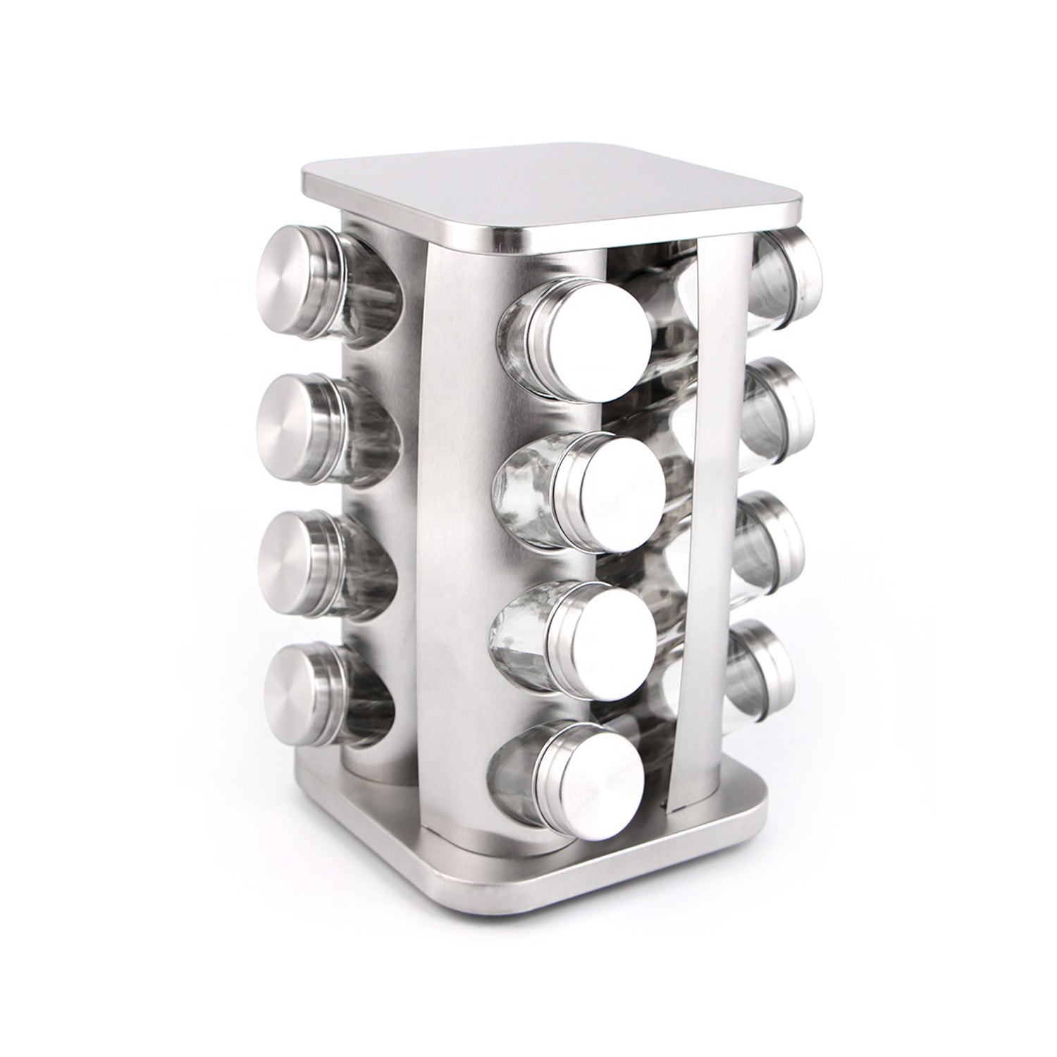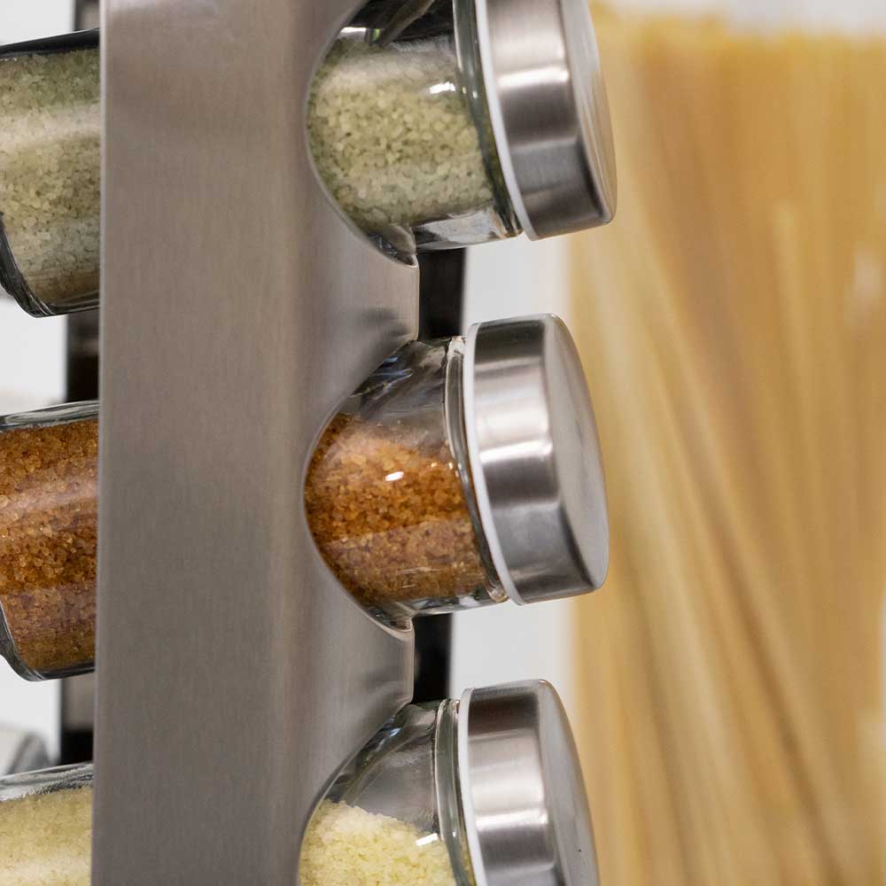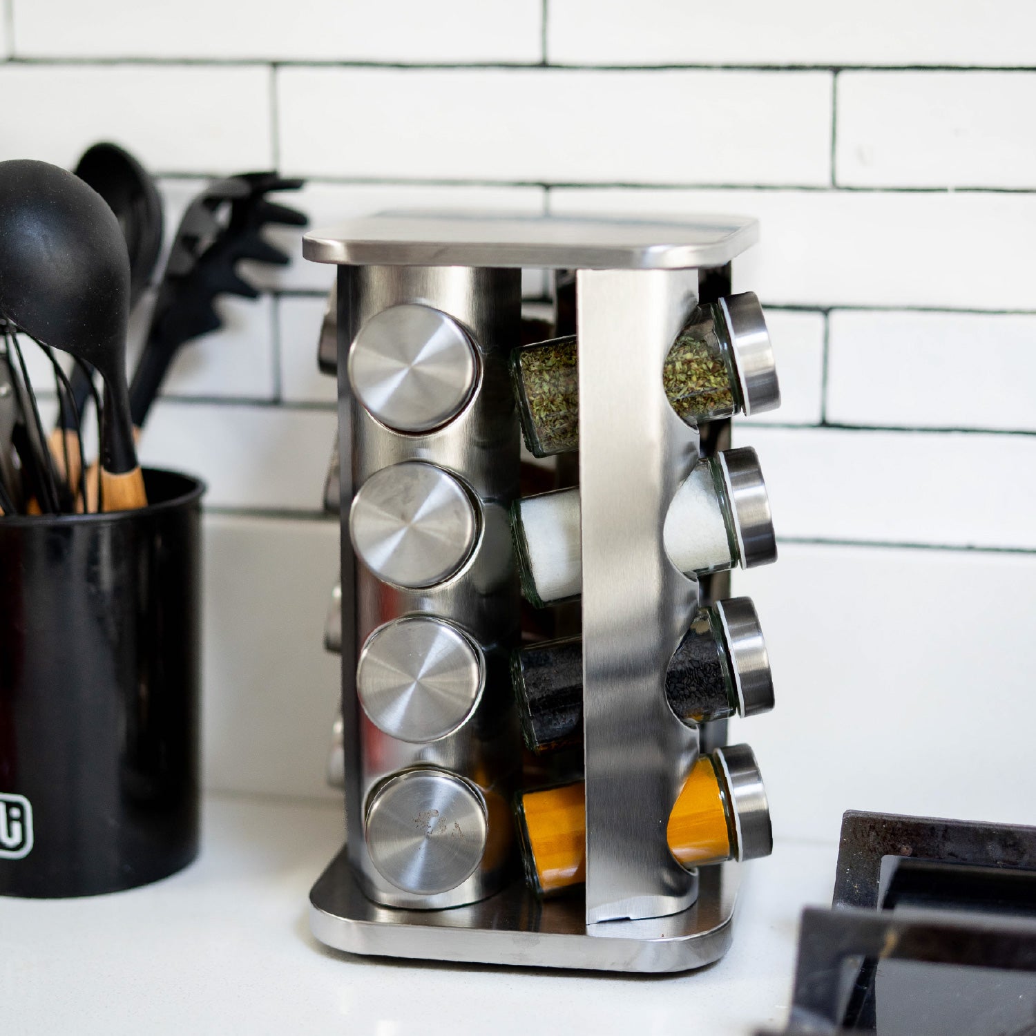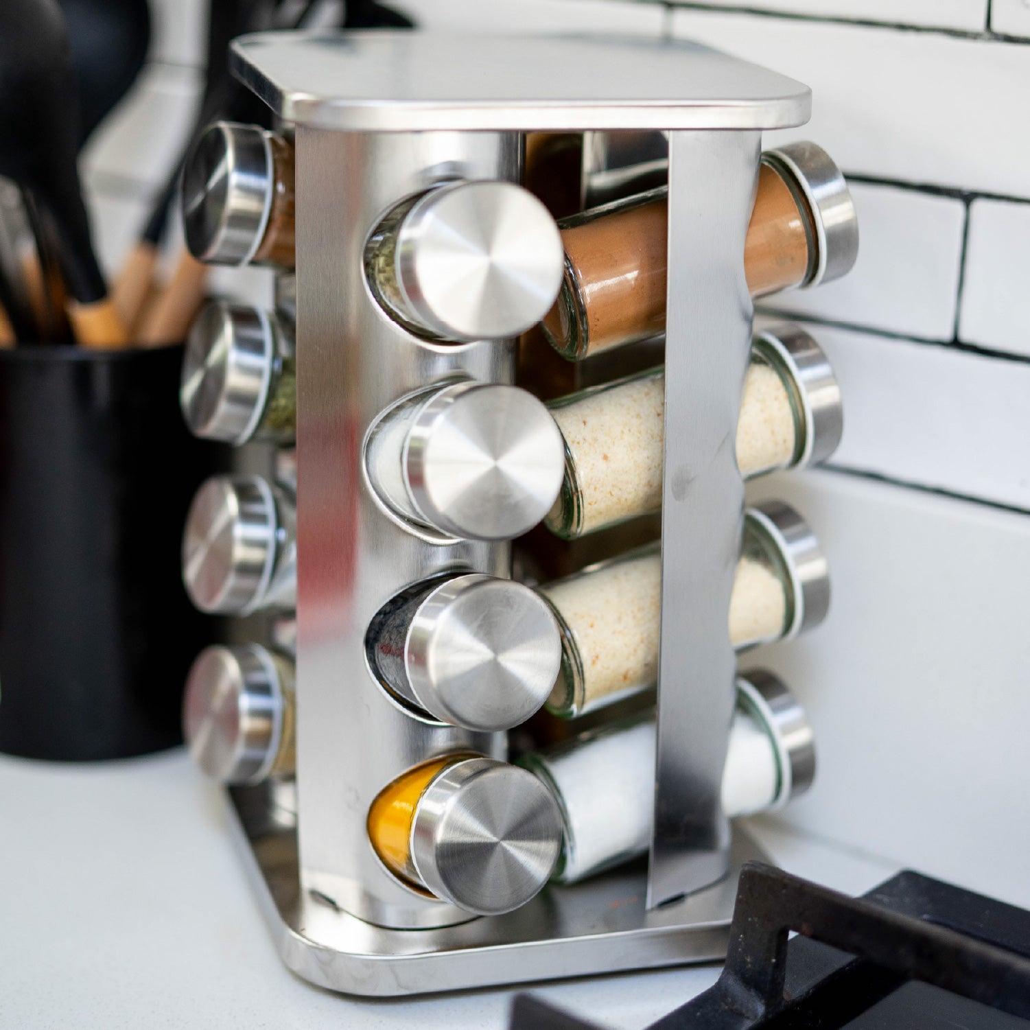 Especiero Condimentos Giratorio Metálico 16 Frascos Simplit las medidas son 28 cm de alto por 15 cm de alto la base y el frasco 10cm de alto por 4.5 de ancho. Simplemente gira el especiero y tienes al alcance de la mano tus 16 condimentos y especias favoritas. Cada frasco de vidrio tiene tapa de aluminio y dosificador.