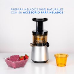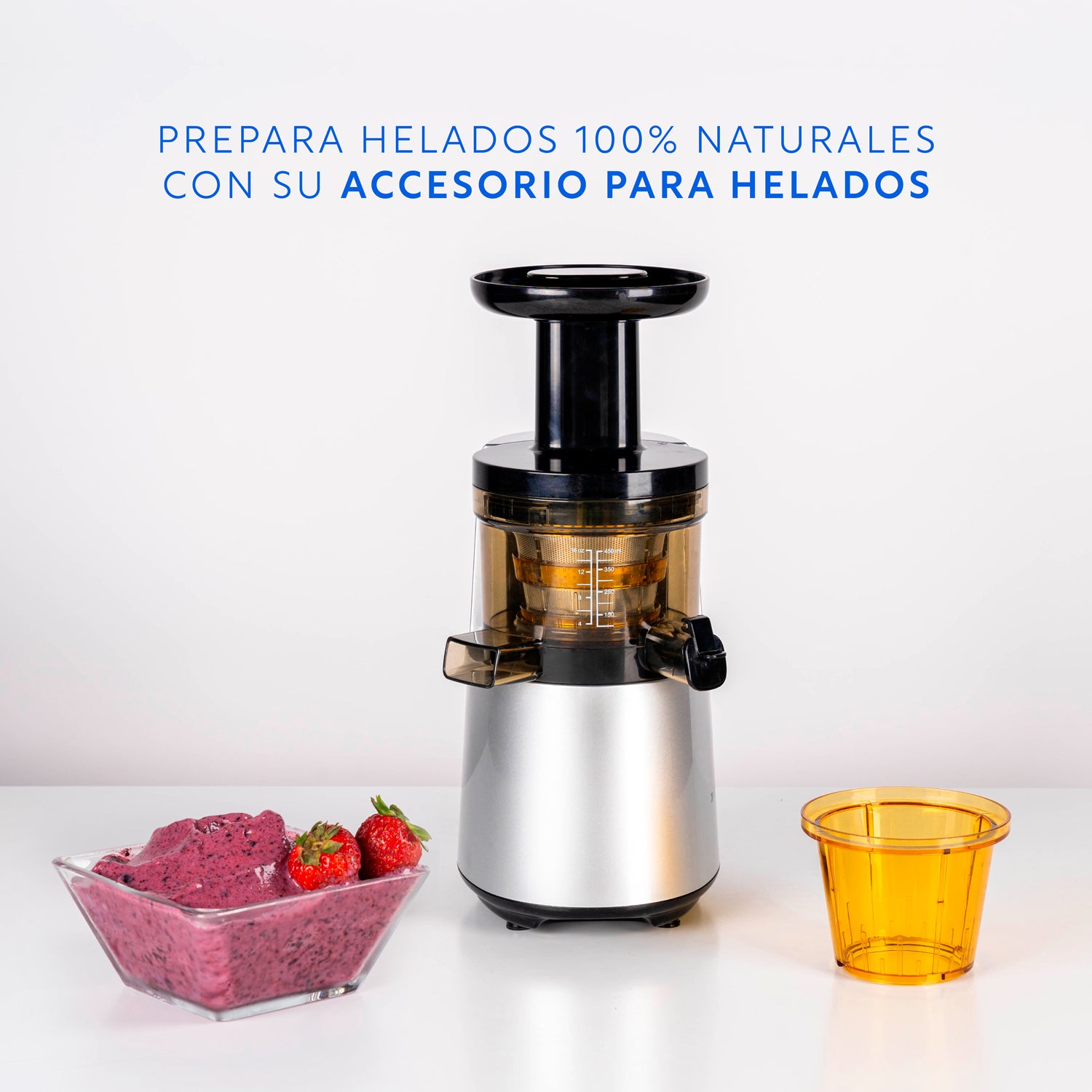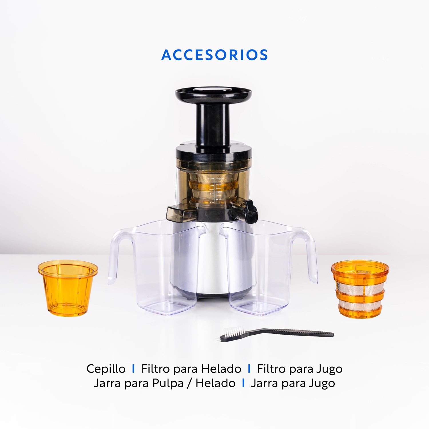 Su potente motor de alta eficiencia evita atascamientos, es silencioso y se puede utilizar por 30 minutos en forma continua. Es de fácil uso y limpiado. Tiene piezas libres de BPA, desmontables y aptas para el lavavajillas. Posee un filtro para jugos y otro especial para helados.
