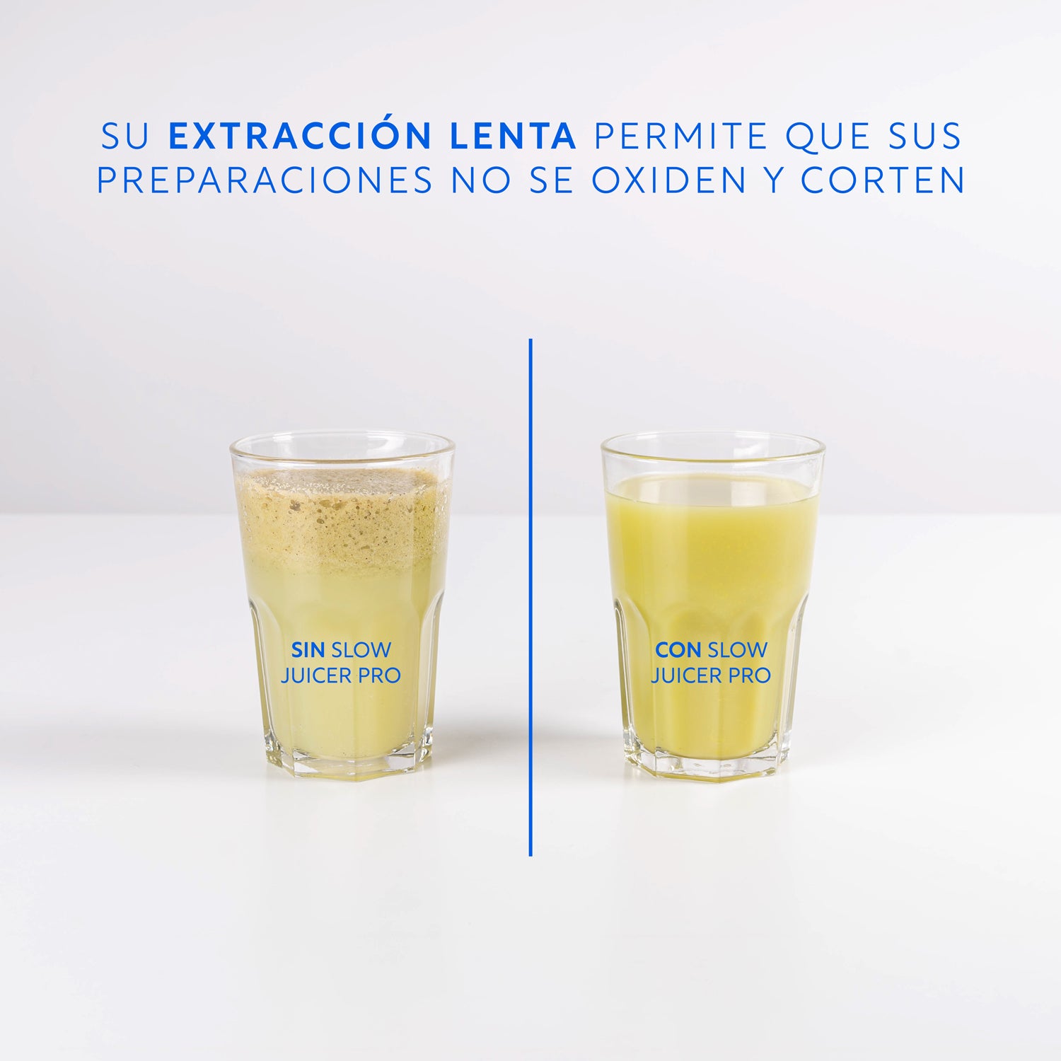 Prepara jugos, helados y leches vegetales poderosamente nutritivos y que se conservan por más tiempo gracias a su baja velocidad de prensado de 43 RPM. La tecnología de extracción lenta permite conservar los nutrientes sensibles al calor como las vitaminas A y C, y enzimas vivas, a diferencia de las licuadoras que, por su funcionamiento a alta velocidad, generan calor degradando los beneficios de las frutas y verduras.
