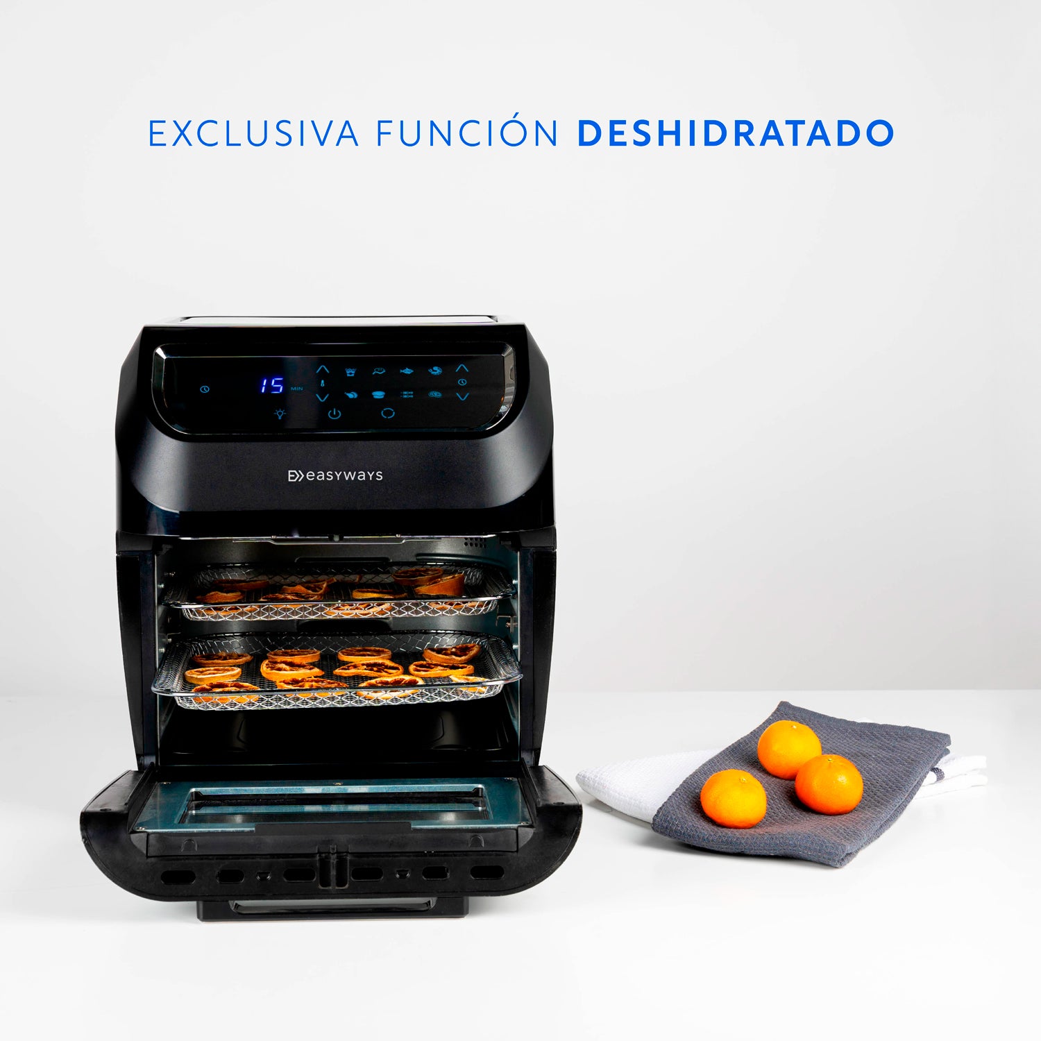 Puedes cocinar papas fritas en 15 a 20 Minutos, cocer Chuletas de cerdo en 10 a 14 minutos y verduras rellenas en 10 minutos, hamburguesas en 7 a 14 minutos, una Quiche en 22 minutos. Por otro lado, tiene control de tiempo de 2 hasta 24 horas para su función de deshidratar.