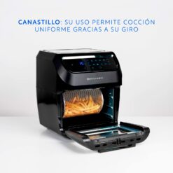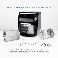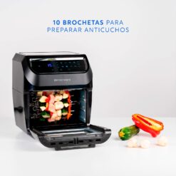 Los múltiples aditamentos, como bandejas, canasto, espiedo, brochetas; Air Fryer Plus te permite cocinar Papas, Carnes, Chuletas, Pescados, Verduras, Tocino, Nugget, Masas, Comida Congelada, es decir un mundo de recetas y comidas además de las mejores papas fritas. Puedes seleccionar las funciones programadas o usarla en forma manual, seleccionando el tiempo y la temperatura.
