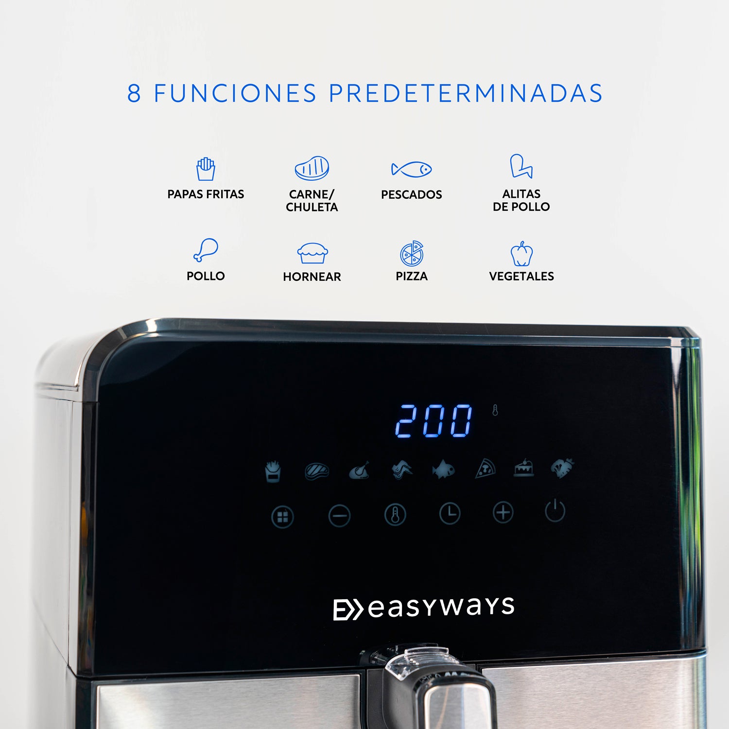 La Air Fryer XL de EasyWays cuenta con un Cajón antiadherente con capacidad para 6.2 litros, lo que te permite cocinar grandes cantidades de alimentos de una sola vez. Además, con sus 8 funciones predeterminadas podrás preparar desde papas fritas y alitas de pollo, hasta pescados y verduras, todo con solo tocar un botón.