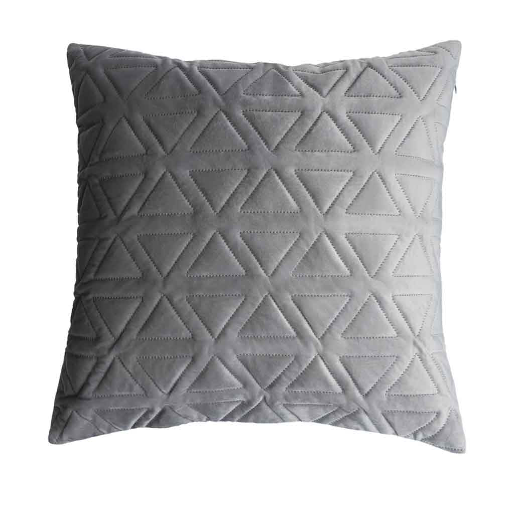 Funda cojín Triangle de 100% poliéster en tonos gris, terciopelo liso. Este cojín encaja a la perfección con el Estilo Nórdico, destacando en la tendencia actual de materiales naturales, patrones geométricos, inspiración vintage y colores neutros.