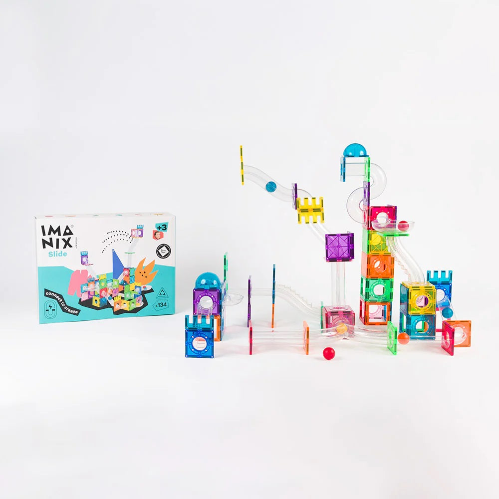 Crea tu propio tobogán y deja que la pelotita ruede sin parar. El juego de bloques de construcción IMANIX Tobogán de 134 piezas es perfecto para ello. Construye un circuito en 2D y 3D con bloques geométricos de diferentes tamaños, colores y curvas.