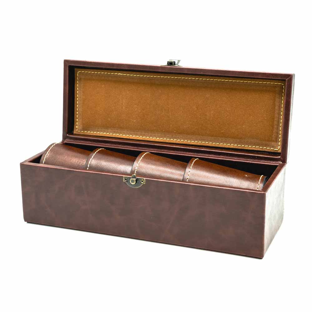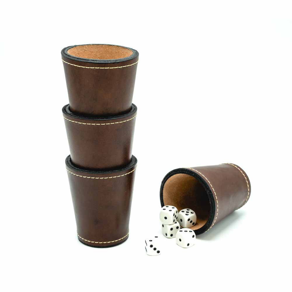 Increíble juego de 4 cachos de cuero hechos a mano con sus respectivos 20 dados y caja para su mejor traslado.