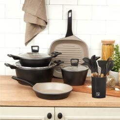 La batería es de aluminio fundido a presión con revestimiento antiadherente Pfluon qué puede conducir el calor de manera más rápida y uniforme. Su revestimiento exterior resiste a altas temperaturas.