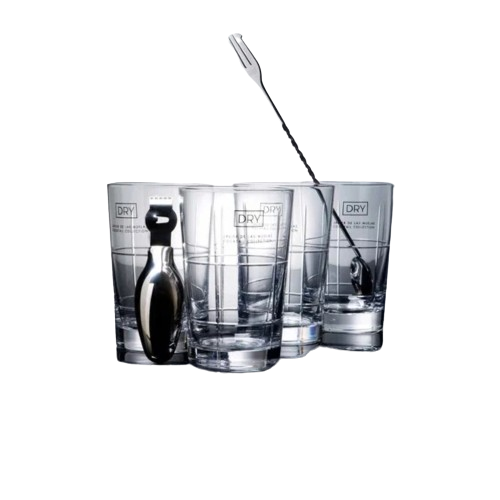 set Gin & Tonic Dry Collection de Balvi. Este conjunto es esencial para los aficionados a los cócteles y aspirantes a barman que desean perfeccionar su técnica en la creación del icónico Gin Tonic. Compuesto por cuatro vasos de vidrio cristalino y una cuchara mezcladora de acero con un diseño retorcido, este set es el aliado perfecto para tus reuniones familiares o encuentros con amigos. Los conocedores saben que el orden de los ingredientes es clave: vierte primero la tónica y después la ginebra con la ayuda de la cuchara para una mezcla perfecta y un sabor equilibrado.