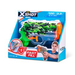 El lanza agua nano skins 100 ml con sistema de llenado rápido Fast Fill de X-Shot es un divertido y compacto juguete que ofrece horas de diversión en los días calurosos. Con su diseño ergonómico y su peso ligero, es fácil de transportar y usar. Este lanza agua tiene un tanque de 100 ml de capacidad, que se puede llenar rápidamente con su moderno sistema de llenado rápido, simplemente sumérgela en agua y tira del gatillo para llenarla. Además de sus características técnicas, este lanza agua ayuda a los niños desarrollar sus habilidades motoras finas, la coordinación mano-ojo, la puntería y la orientación espacial, siendo este una excelente opción de regalo para niños de todas las edades, para disfrutar durante los días de verano.