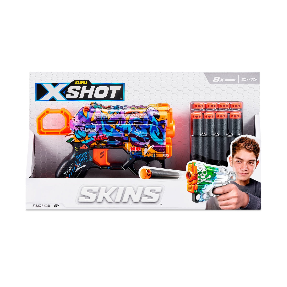 Con los nuevos lanza dardos menace skins de X-Shot le ofrecerá a los más pequeños de la casa interminables horas de juego y diversión. Los niños podrán demostrar su habilidad y puntería alcanzando a todos sus contrincantes. El diseño de carga frontal hace que la inserción de dardos sea un paso simple permitiéndole lanzar un dardo uno tras otro, permitiéndole a los niños estar en total movimiento de una manera más entretenida e interactiva promoviendo el juego físico y social. Además, este juguete es perfecto ya que contribuye en el desarrollo de la creatividad, potencia la puntería, destreza, la comprensión causa/efecto y la orientación espacial. Incluye 8 dardos de espuma de X-Shot. Cada uno se vende por separado.