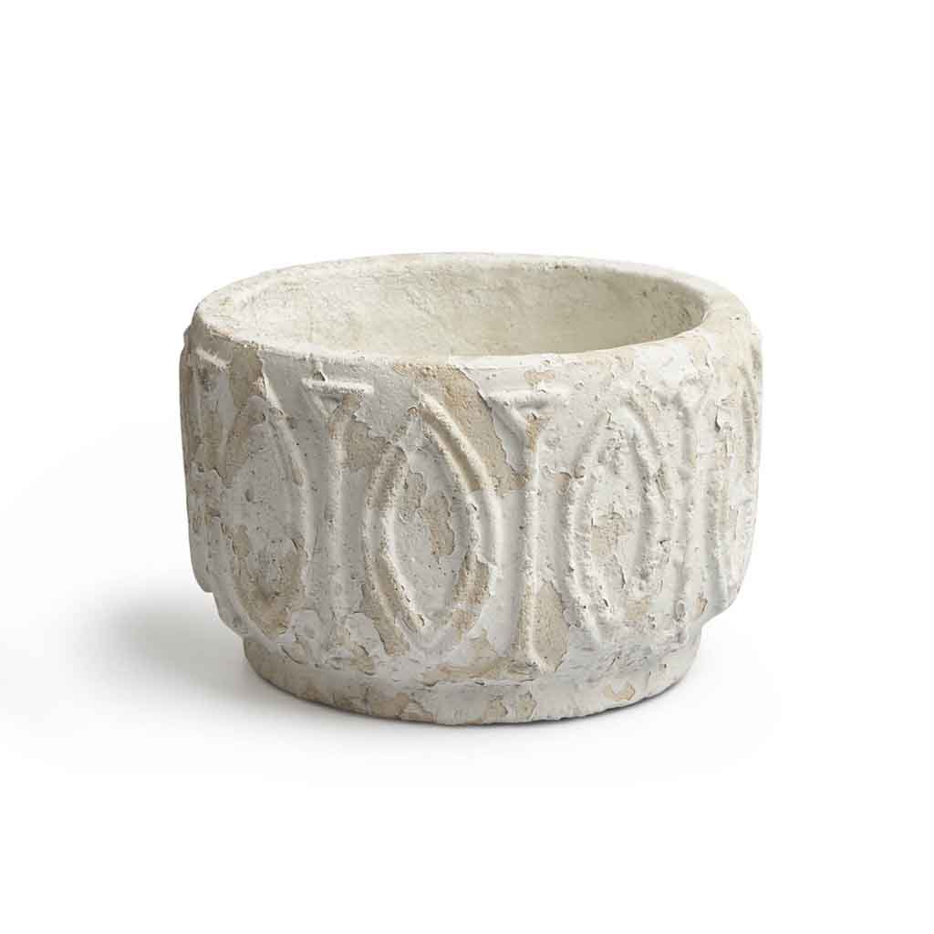 Maceta Ios Alto Grabado Blanco BVS. Su textura antigua aporta personalidad a tú ambiente. ESTILO NÓRDICO. Encaja en esta tendencia actual que incluye materiales naturales, dibujos geométricos, inspiración vintage y colores neutros. El encanto de un producto artesano con riqueza en su acabado natural.