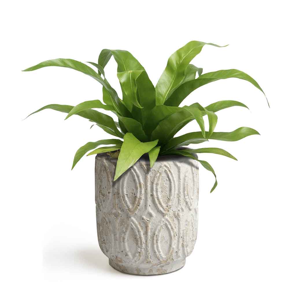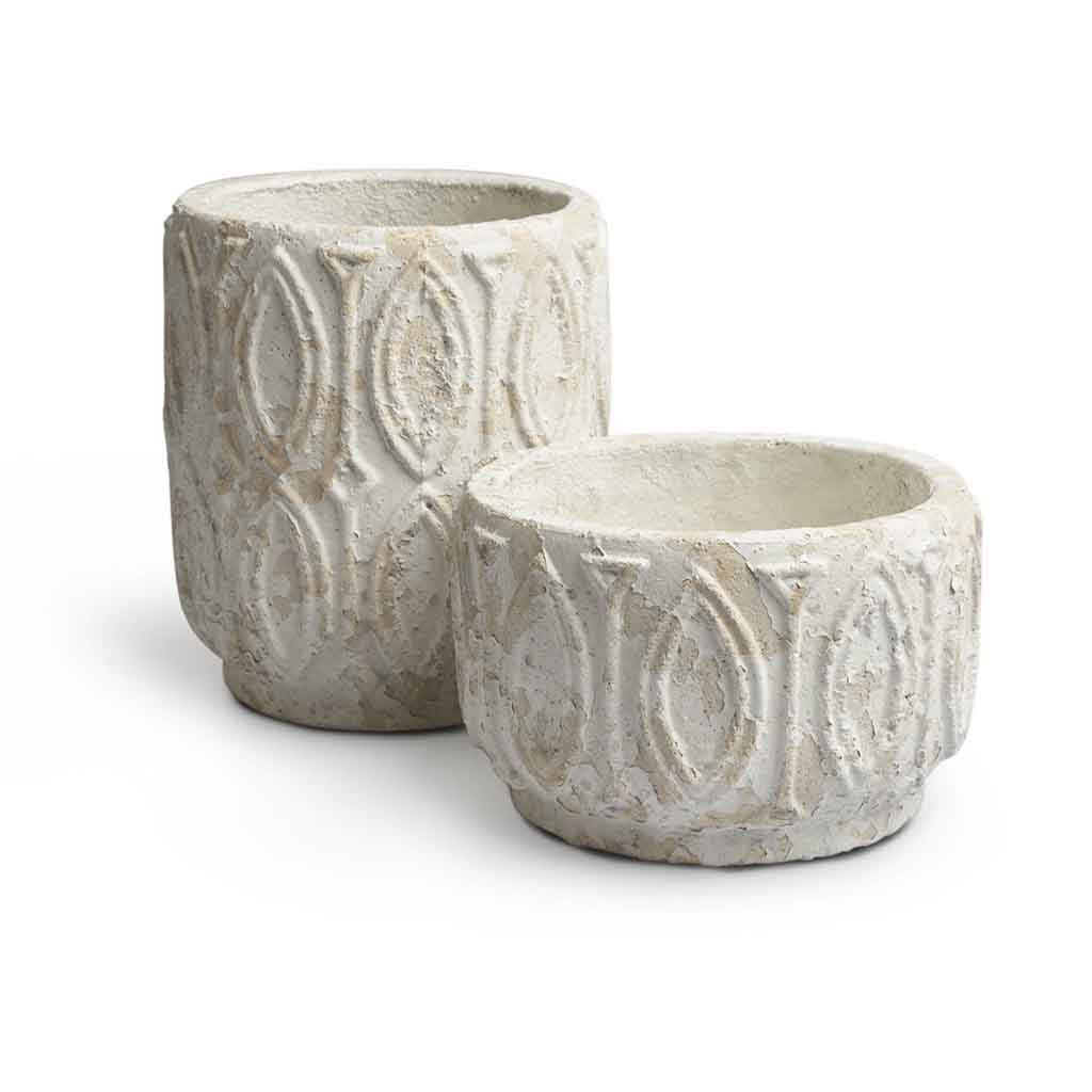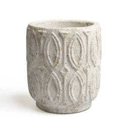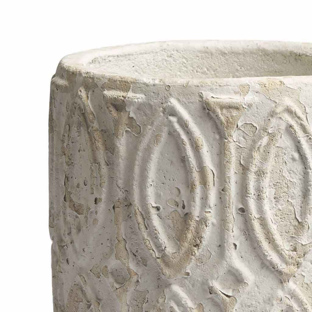 Maceta Ios Bajo Grabado Blanco BVS. Su textura antigua aporta personalidad a tú ambiente. ESTILO NÓRDICO. Encaja en esta tendencia actual que incluye materiales naturales, dibujos geométricos, inspiración vintage y colores neutros. El encanto de un producto artesano con riqueza en su acabado natural.