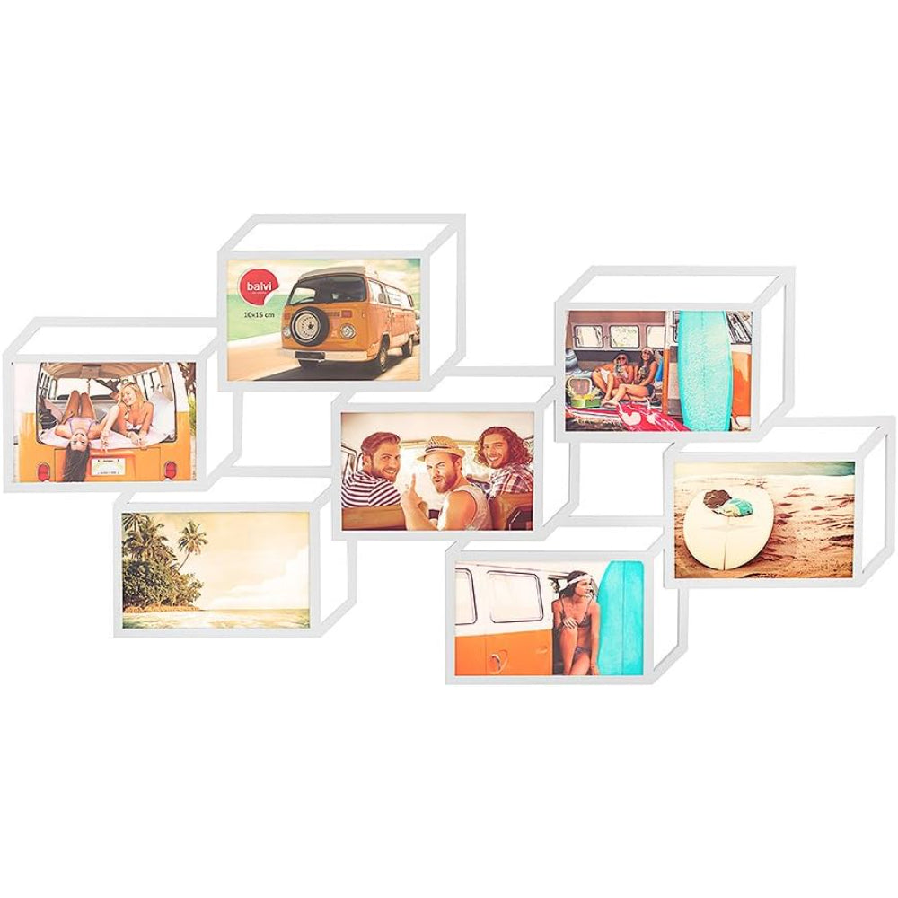 El contraste entre el color negro del marco y el blanco de las fotos crea un efecto visual impactante, lo que permite que tus imágenes cobren vida y destaquen de manera notable. Con espacio para siete fotos, puedes crear una composición única y personalizada, exhibiendo tus recuerdos más preciados de una manera cautivadora.
