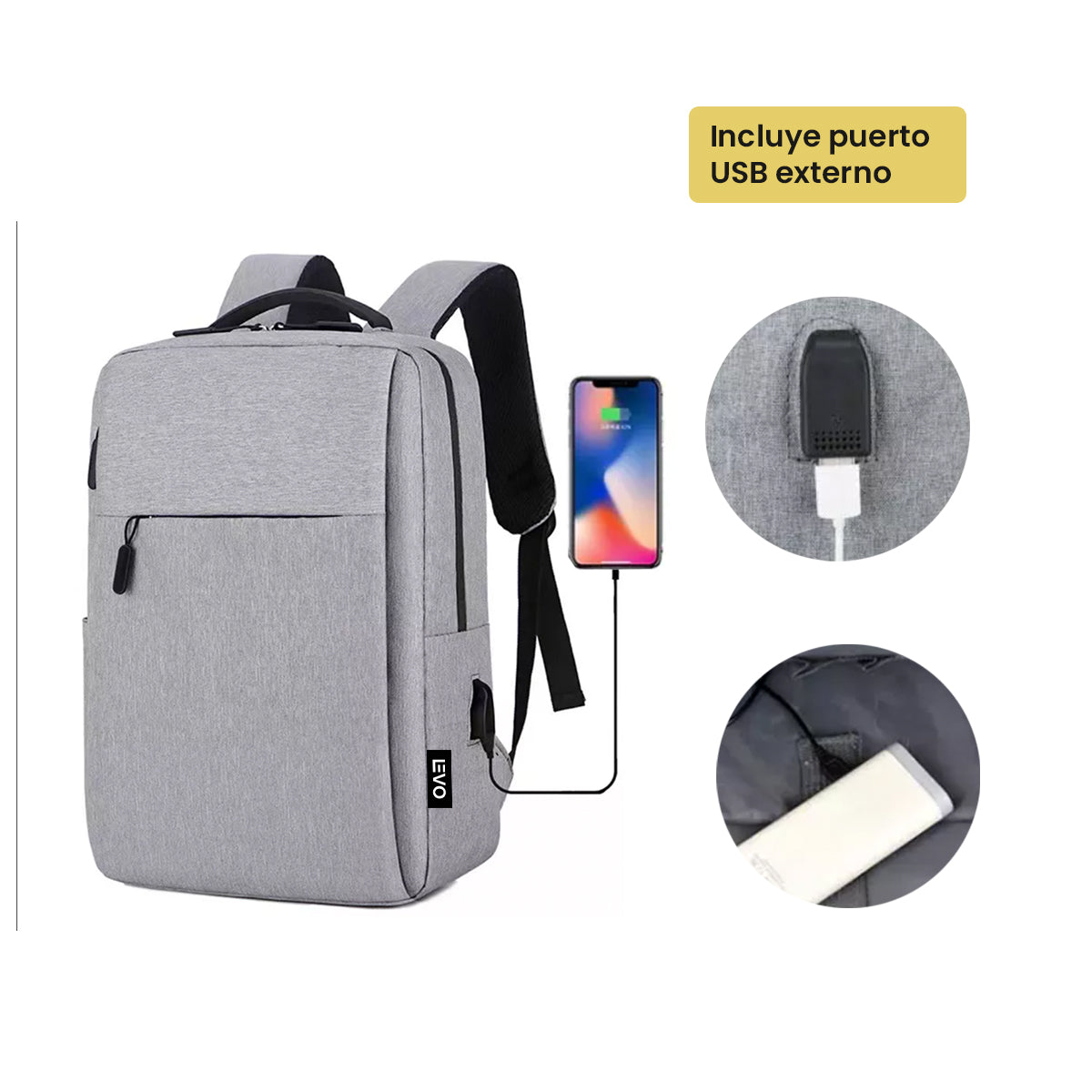 Mochila para Notebook con Puerto USB 15″ Levo, perfecta para ir al trabajo o para la universidad. Incluye compartimiento para tu computador de hasta 15,6″. Tiene 1 bolsillo exterior con sistema antirrobo y compartimientos al interior para tus accesorios. Sus correas son ajustables y acolchadas para mayor comodidad. ¿Lo mejor? Incluye puerto USB para conectar al interior una batería externa y poder cargar tu teléfono o lo que quieras.