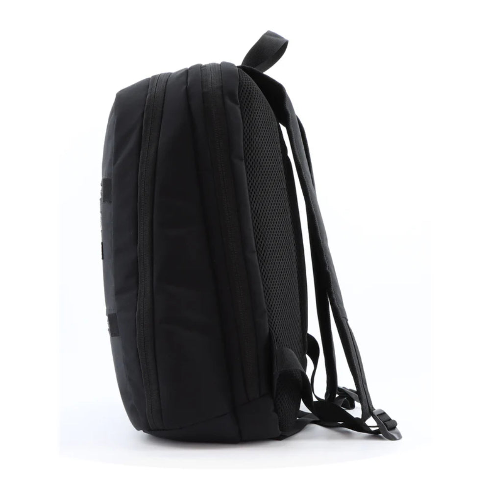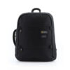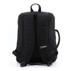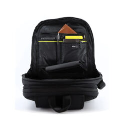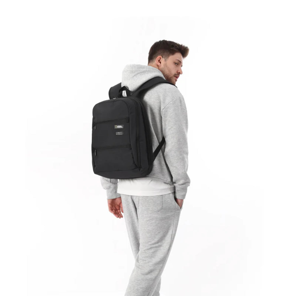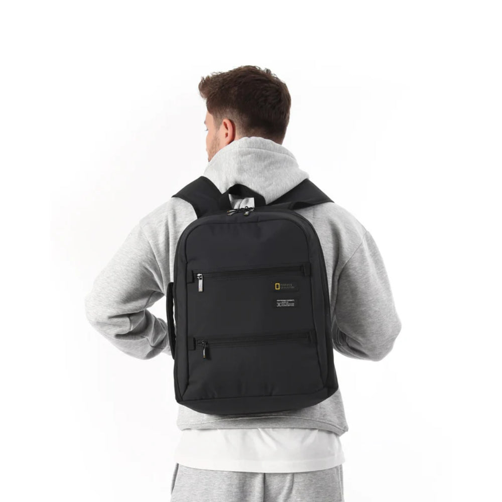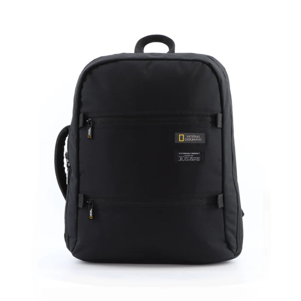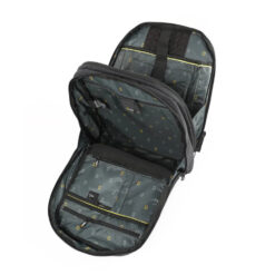 Esta espaciosa mochila multifuncional y ecológica, cuenta con dos compartimentos principales con cierre, con espacio acolchado y panel antishock en su interior para llevar y proteger un notebook / laptop de hasta 15,6″ y tablet de 10″, además de amplios bolsillos interiores con cierre, un bolsillo especial con protección RFID (anti escaneo de chips de tarjetas de credito y documentos), un apartado para lápices y dos bolsillos exteriores con cierre en la parte frontal, uno de ellos con un práctico porta llaves. Sistema de cierre con posibilidad de poner un candado. Cómodos tirantes regulables y un asa lateral en caso que se quiera llevar con la mano. Fabricada de tela de nylon impermeable 100% reciclada de botellas PET.