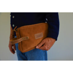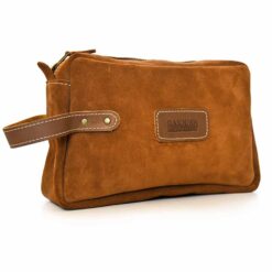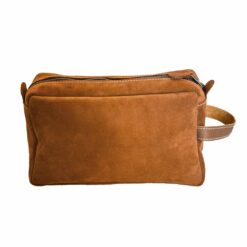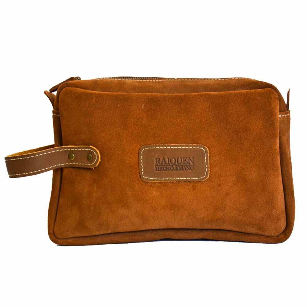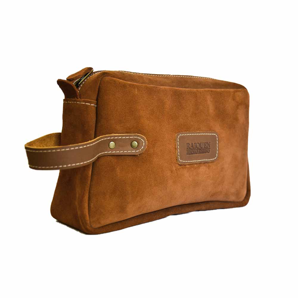 Neceser hecho a mano de cuero reno con manilla de cuero graso con broches, interior forrado en tela, cierre metálico, perfecto para llevar lo más importante de manera organizada.