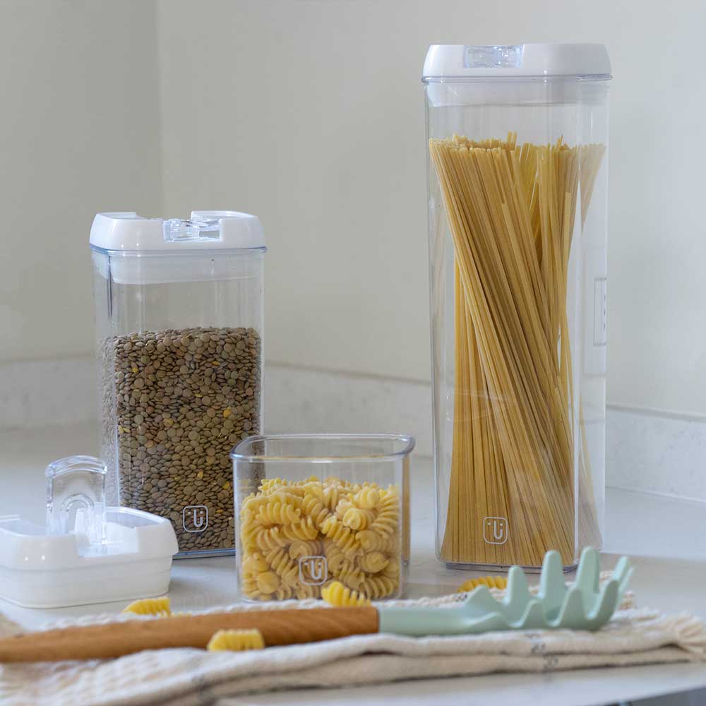 Simplifica el arte de organizar tu cocina con nuestro Pack 14 Contenedores Herméticos Plástico Blanco Simplit. Ideal para pastas, granos, cereales, legumbres y más, estos contenedores no solo te ayudan a mantener tu despensa ordenada, sino que también ofrecen un toque moderno y elegante.
