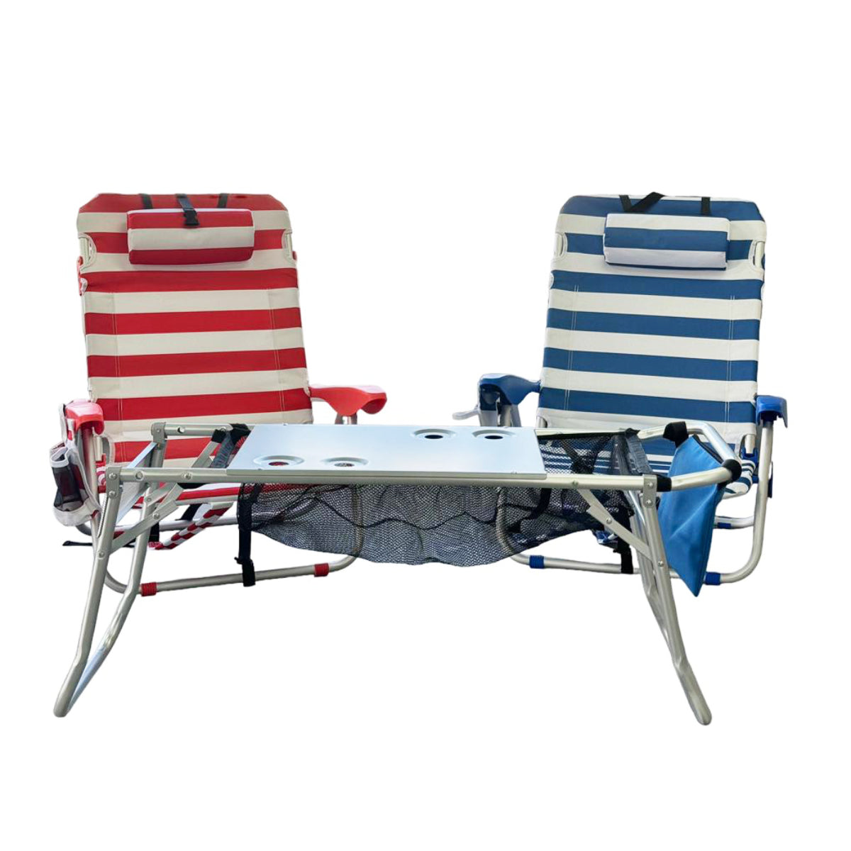 ¡Comodidad portátil! Set de reposeras reclinables rayadas en tono azul + Carro/Mesa transportador, diseñado para los amantes del aire libre y de la comodidad sin límites. Ya sea que te estés preparando para mirar el horizonte del mar, aventurando para ir a acampar, preparándote para mirar a los tuyos jugar en el lago, o simplemente quieres llevar la comodidad de tu living vayas donde vayas, nuestro set está hecho para ti.