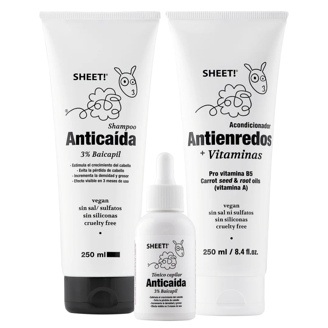 Shampoo Anticaída: Aplica una cantidad de SHAMPOO ANTICAÍDA SHEET directamente sobre el pelo mojado dando pequeños masajes desde la raíz. Deja actuar en el cuero cabelludo 3 minutos y luego enjuaga. Complementar con tónico anticaída