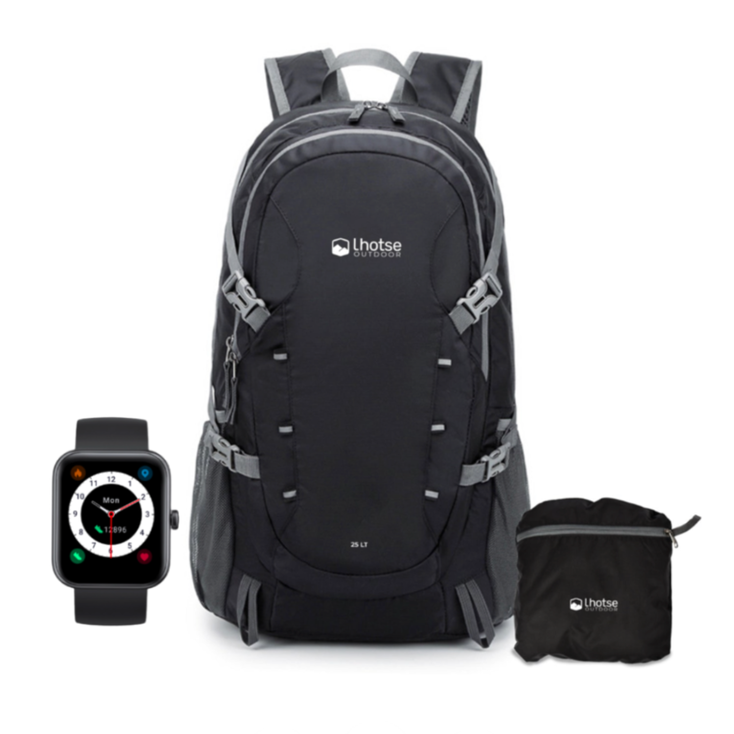 Prepárate para explorar con el Pack que combina la versatilidad de nuestra Mochila Outdoor Plegable y la innovación del Smartwatch Live 206 Black Lhotse.