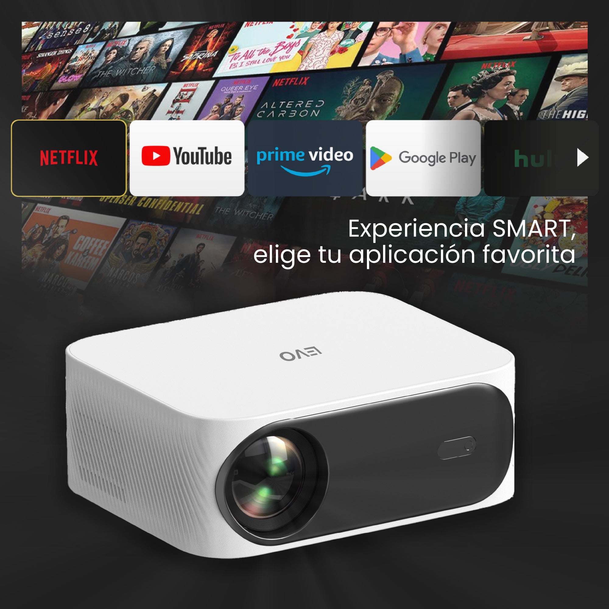 • Proyección ajustable de 49″ a 200″ para adaptarse a cualquier espacio.