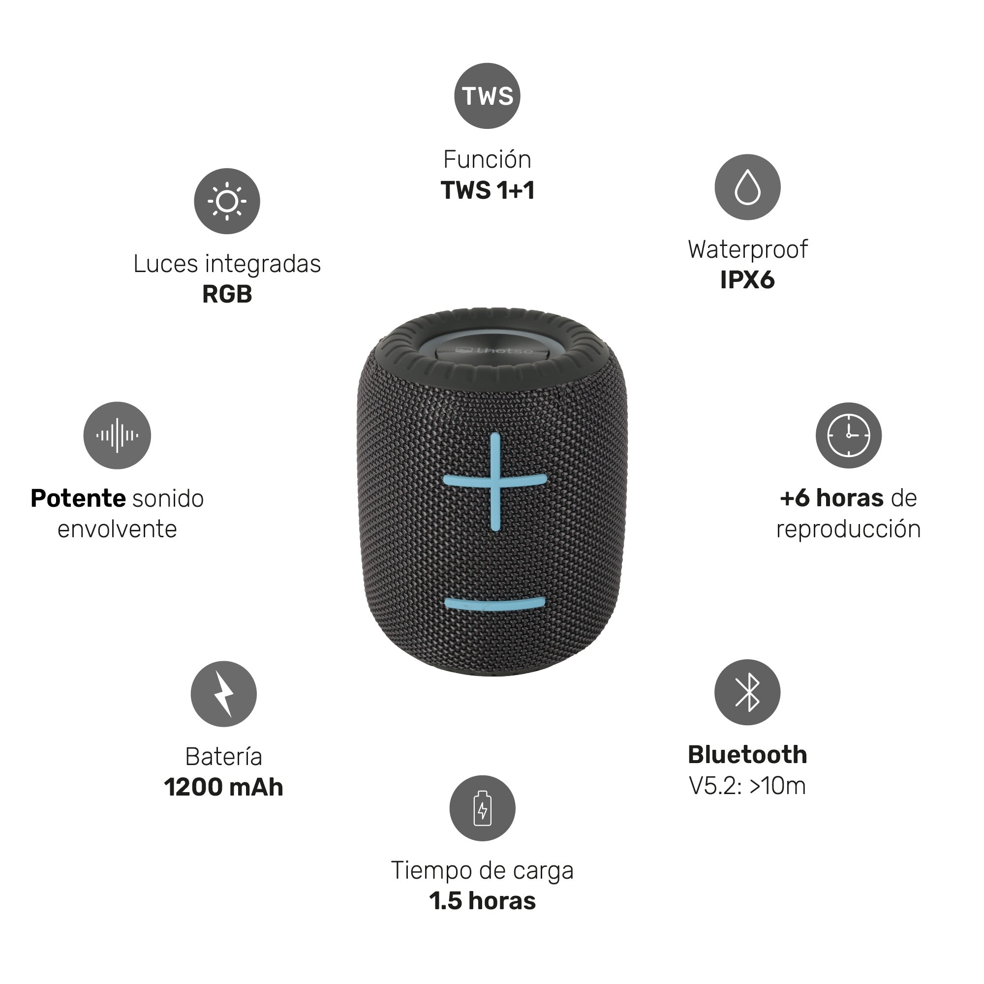 Disfruta de un sonido claro con 6W RMS de potencia, luces RGB integradas y una batería recargable de 1200mAh que ofrece + de 6 horas de reproducción. Su conectividad Bluetooth 5.2 garantiza estabilidad y compatibilidad con todos tus dispositivos.