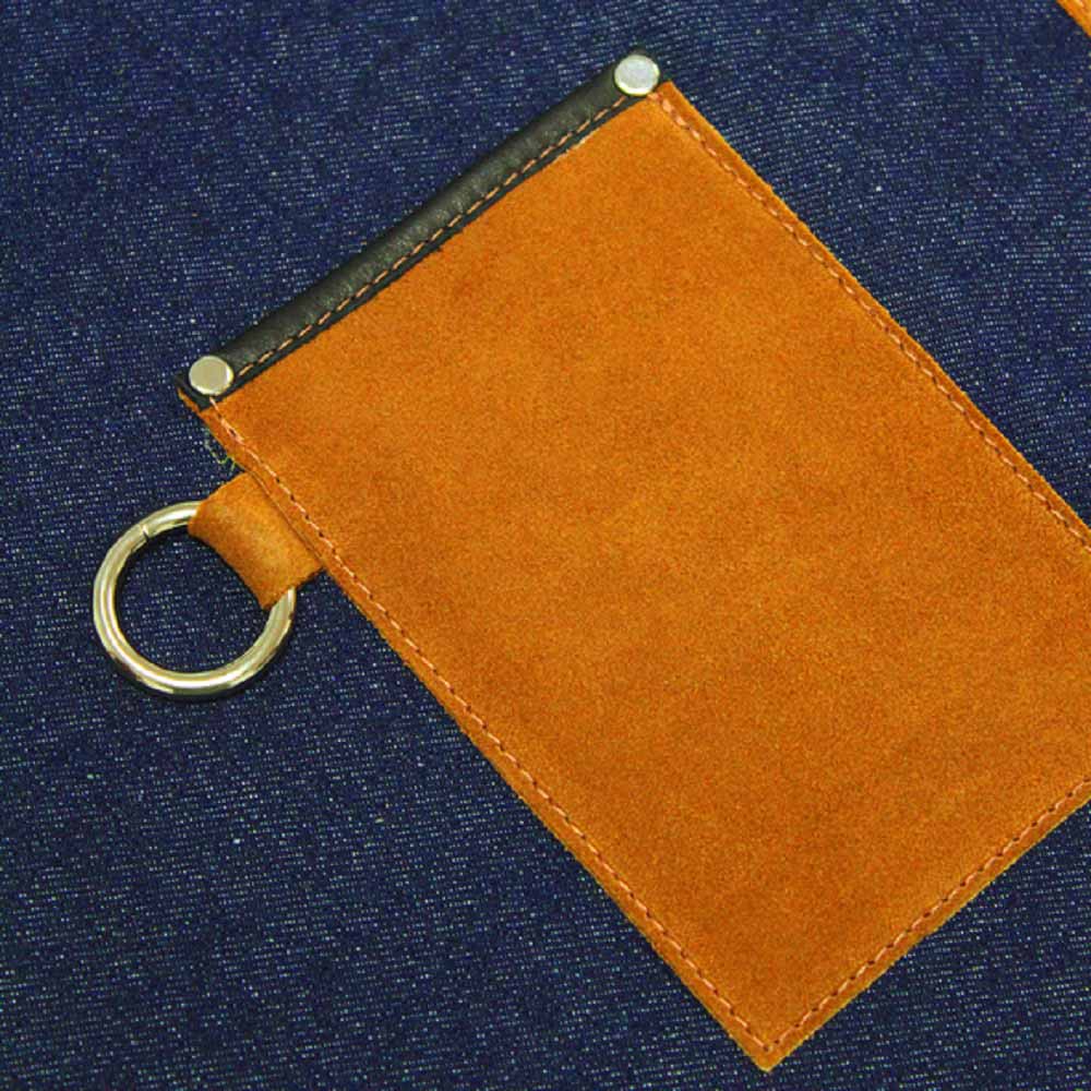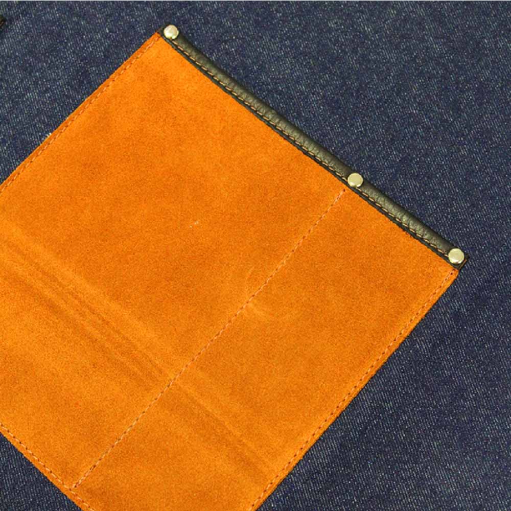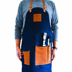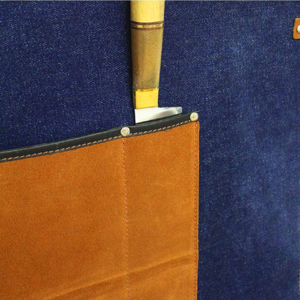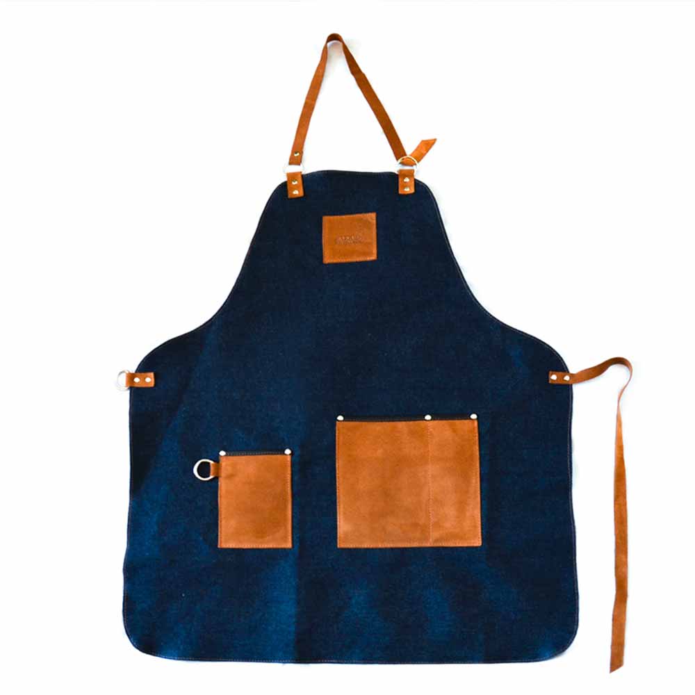 Hecha de mezclilla gruesa y cuero, cuenta con dos bolsillos y un porta cuchillo, una argolla de metal para colgar tu paño o utensilios además de hebillas que hacen el largo y ancho ajustable.