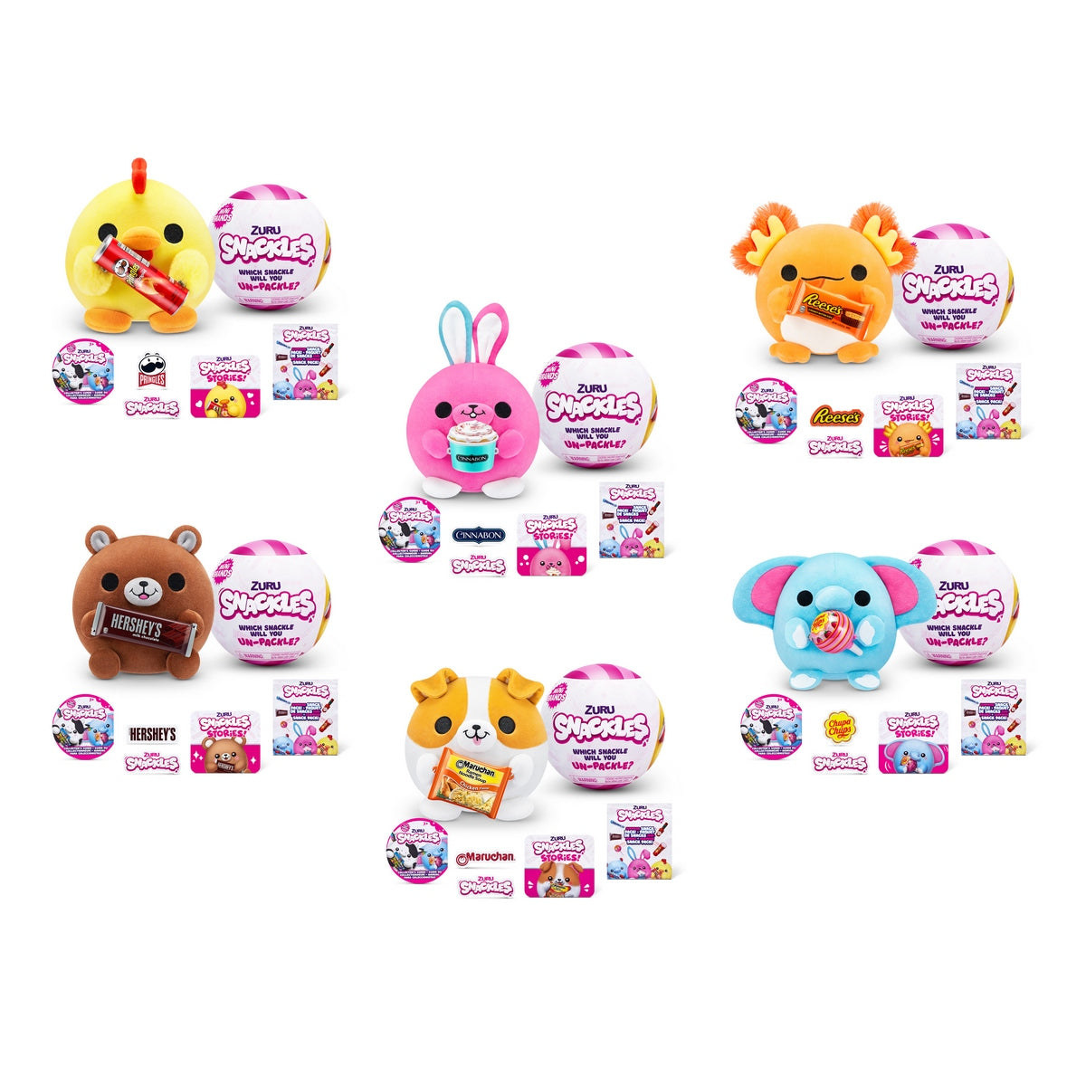 Los peluches en esfera Snackles de Zuru son el juguete perfecto para los amantes de los peluches y los coleccionistas. Estos adorables peluches de 12 cm están hechos de un material super suave y esponjoso lo que lo hace irresistible para apretar. Cada Snackles viene con un snack de una mini marca reconocida, puede ser de Mentos, Hershey´s, Reese´s, Cinnabon, Maruchan, entre otros, también incluyen un cómic de historia de origen y pegatinas, son 11 peluches para coleccionar. Estos Snackles son el regalo perfecto para cualquier ocasión, ideales para niños de todas las edades y también son una gran adicción a cualquier colección de peluches, siendo una manera divertida y creativa de disfrutar. Estas esferas debido a que son sorpresas se envían al azar por lo que los modelos y colores pueden variar de acuerdo con la disponibilidad.