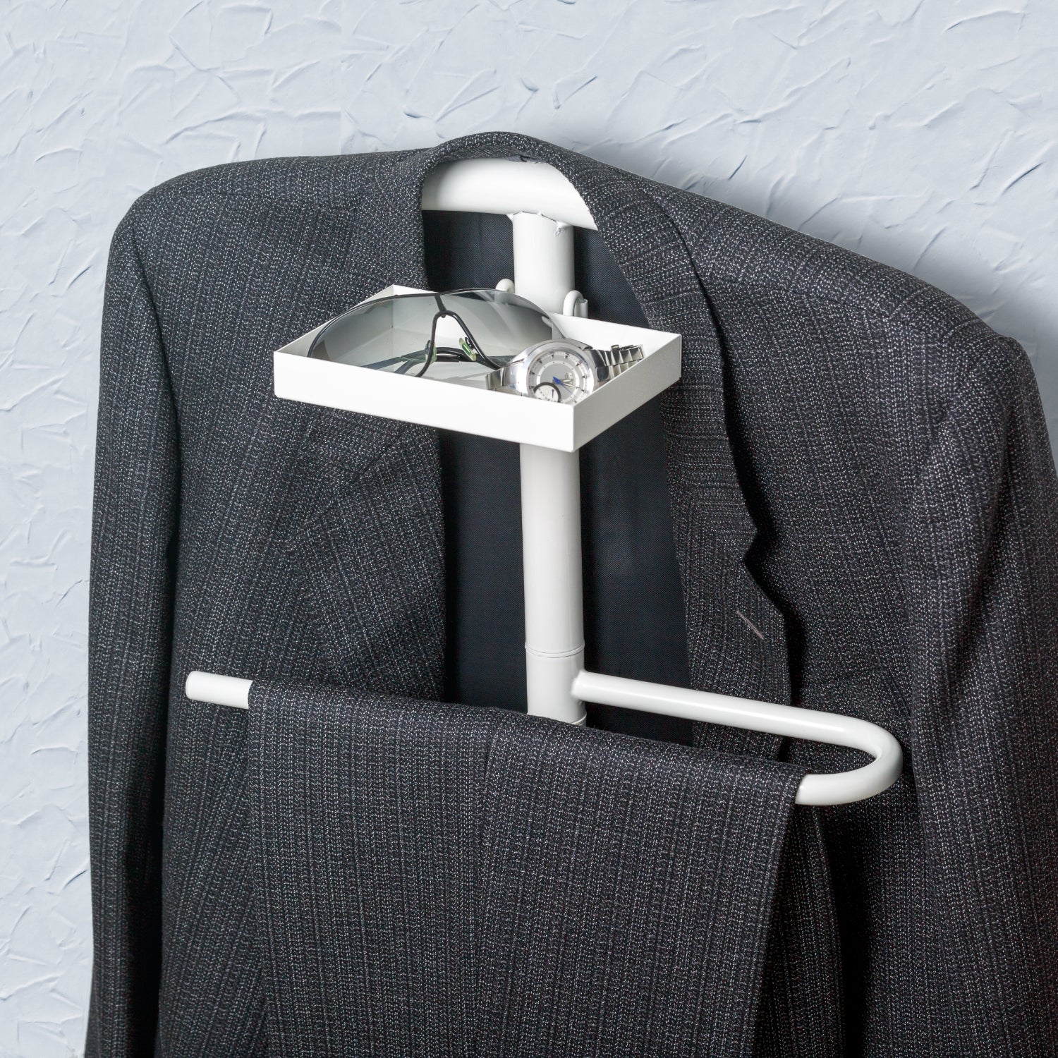 • Incluye una parte superior curvada en forma de percha para tu camisa o chaqueta y una barra para los pantalones.
