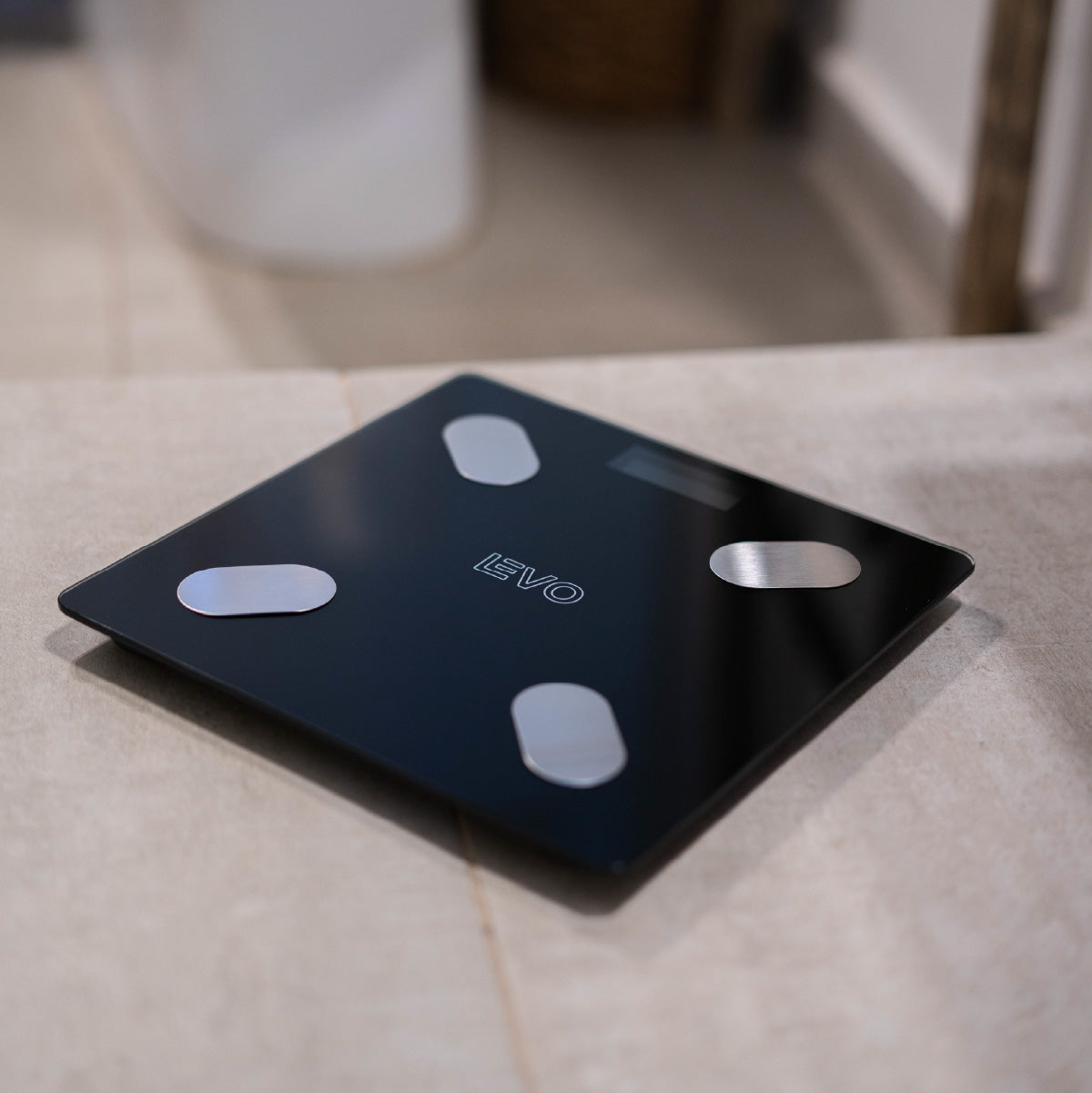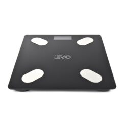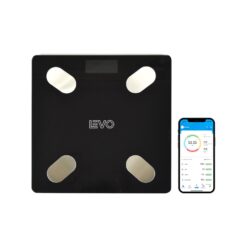 Pesa electrónica negra de vidrio templado con conexión bluetooth. Diseño moderno y limpio e higiénico con encendido automático. Esta pesa de alta precisión mide desde 0,1 kg hasta 180 kg posee bluetooth con conexión a una aplicación en tu teléfono que registra un histórico y actual de tu situación corporal.