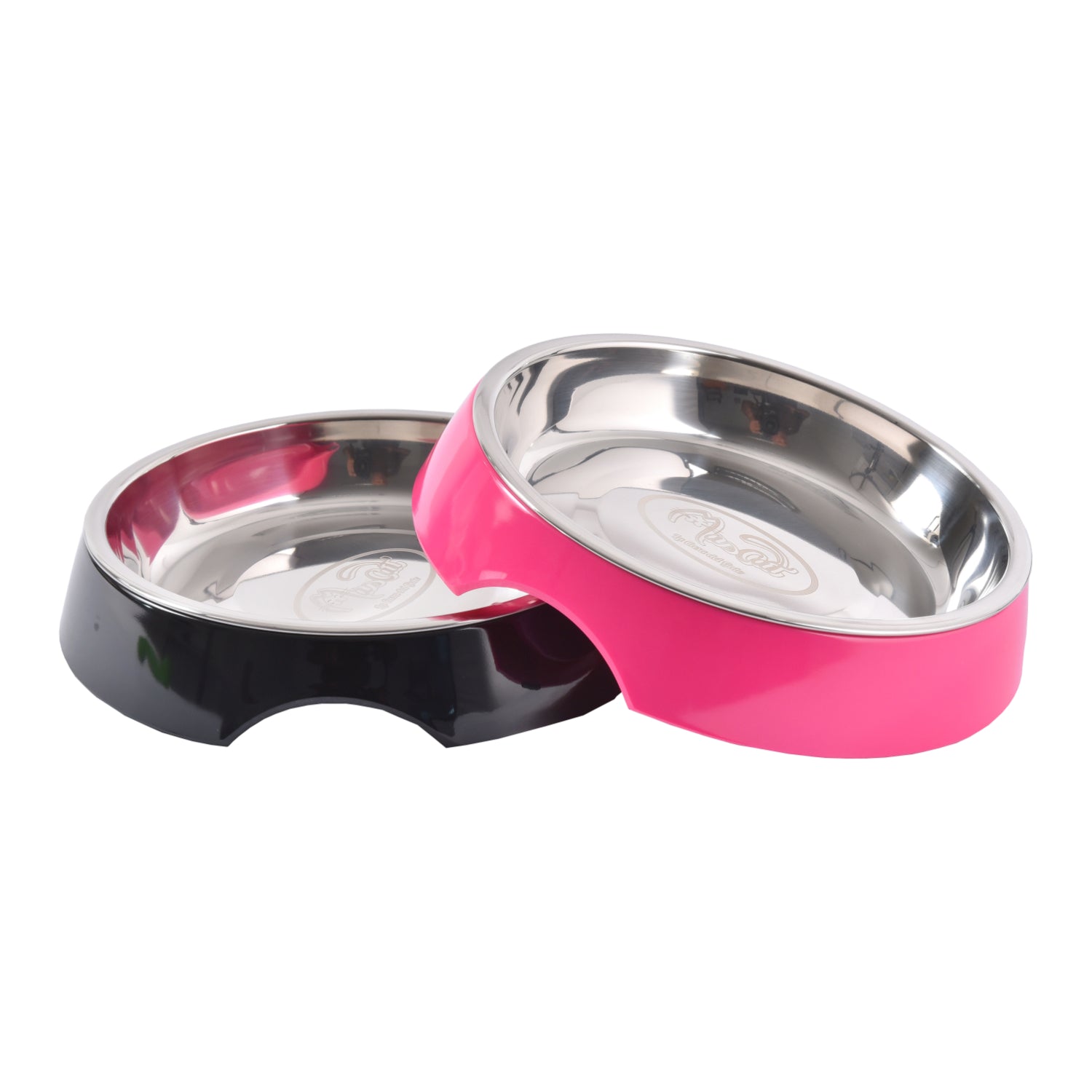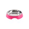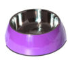 Esta hecho de melamina con plato de acero inoxidable y material antideslizante en su base. Es muy resistente y fácil de lavar, viene en distintos colores: Azul, negro, morado y fucsia.