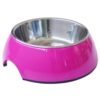 Esta hecho de melamina con plato de acero inoxidable y material antideslizante en su base. Es muy resistente y fácil de lavar, viene en distintos colores: Azul, negro, morado y fucsia.