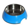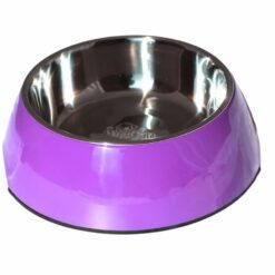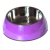 Esta hecho de melamina con plato de acero inoxidable y material antideslizante en su base. Es muy resistente y fácil de lavar, viene en distintos colores: Azul, negro, morado y fucsia.