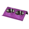 Esta hecho de melamina con plato de acero inoxidable y material antideslizante en su base. Es muy resistente y fácil de lavar, viene en distintos colores: Azul, negro, morado y fucsia.