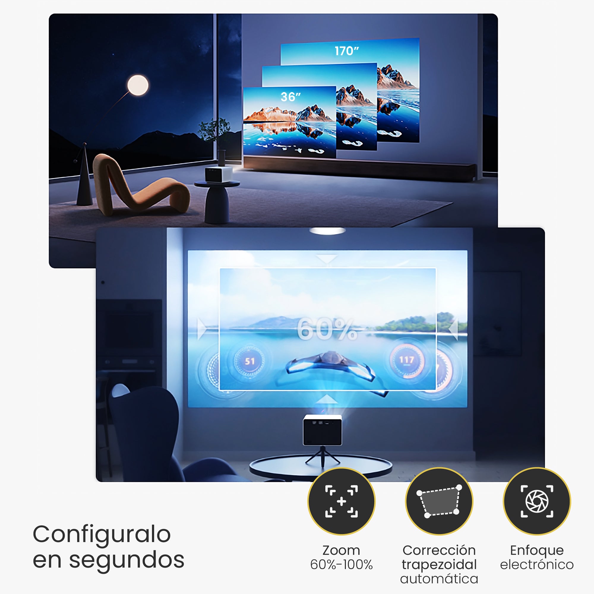 • Tamaño Proyección: 36-170 pulgadas