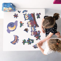 ¡Novedoso puzzle doble de 39pcs con forma y diseño de búho, podrás armar 3 puzzles, cada uno impreso por ambos lados, por un lado, es de día y por el otro de noche! Tamaño del puzzle armado 63 x 40 cm. Hecho en cartón altamente resistente.