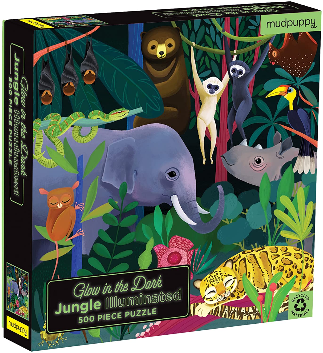 Reúne animales en la naturaleza con el rompecabezas familiar de 500 piezas Selva de Mudpuppy que brilla en la oscuridad. ¡Después de completar el rompecabezas, apaga las luces para ver como despiertan los animales nocturnos!